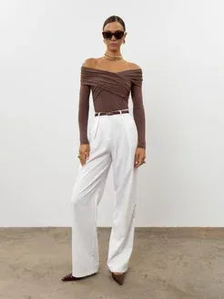 The Aria Pullover is an elegant and sophisticated piece designed for special occasions. Crafted from a soft viscose and elastane blend, this cappuccino brown top offers a fitted silhouette with a flattering Carmen off-shoulder neckline and delicate draping across the chest. The long sleeves provide a sleek, elongated look while enhancing the feminine shape.