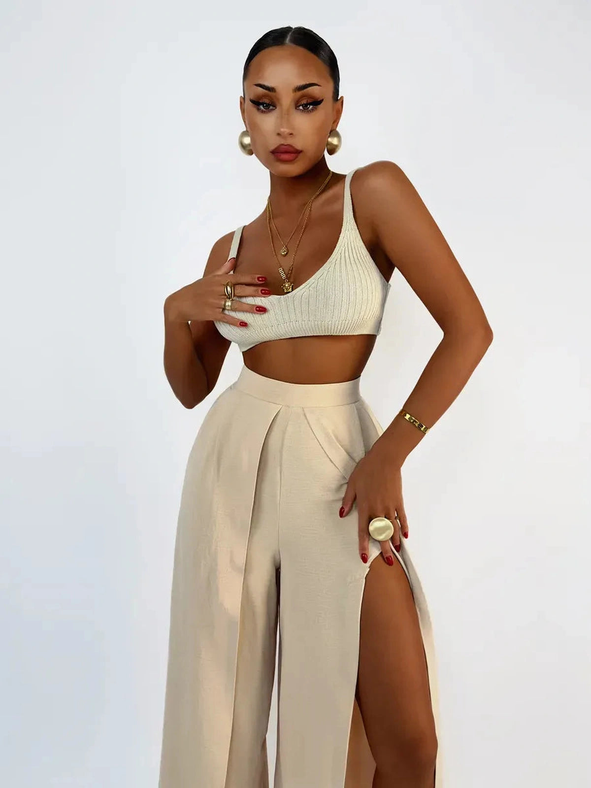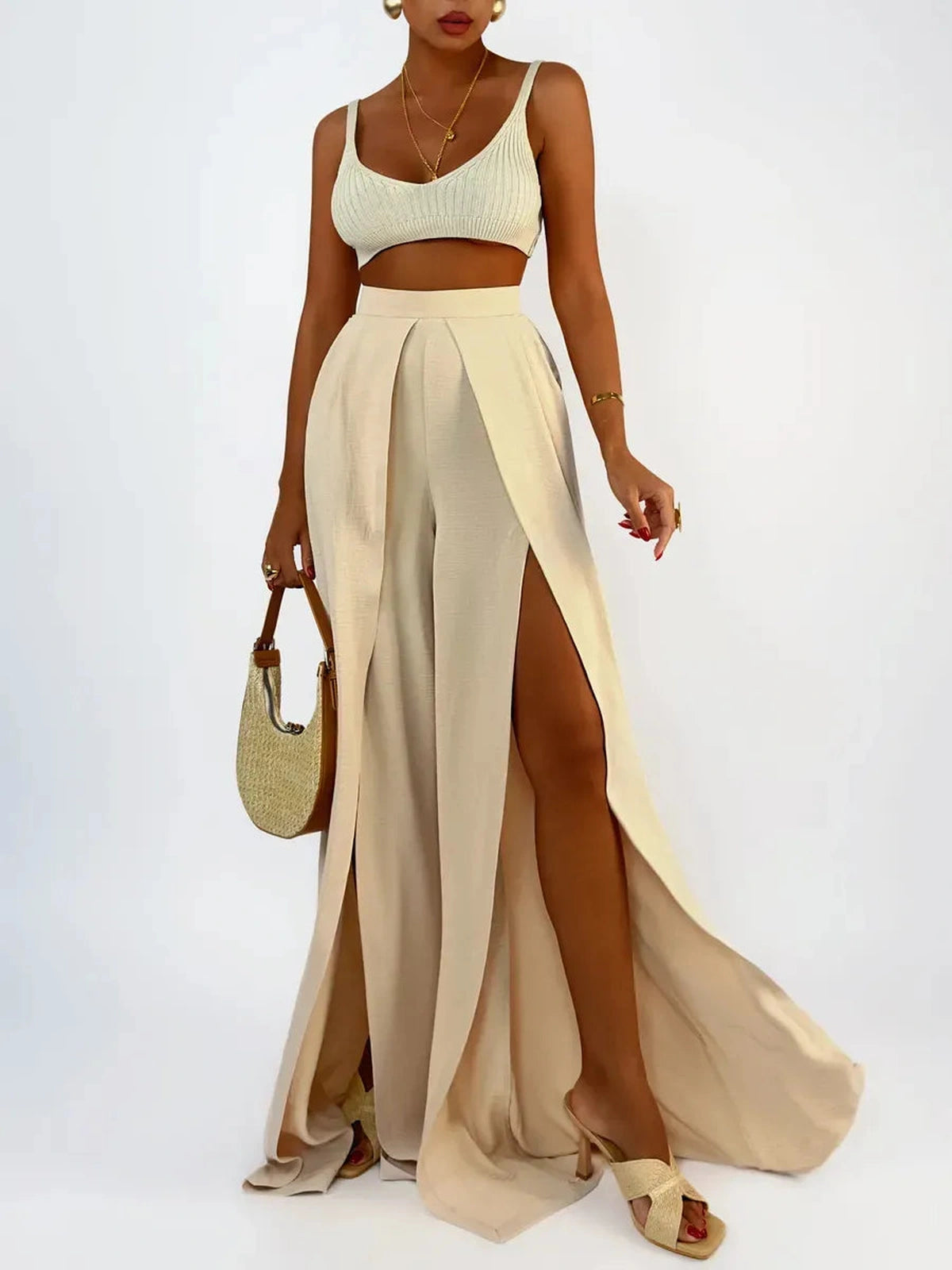Introducing the Aurelia Pants, a refined choice for the modern woman seeking style and comfort. These wide-leg palazzo trousers feature a high waist that sculpts and elongates the silhouette, offering a flattering and sophisticated look. The elegant front slits add movement and a chic touch, making them perfect for summer events and evening occasions.