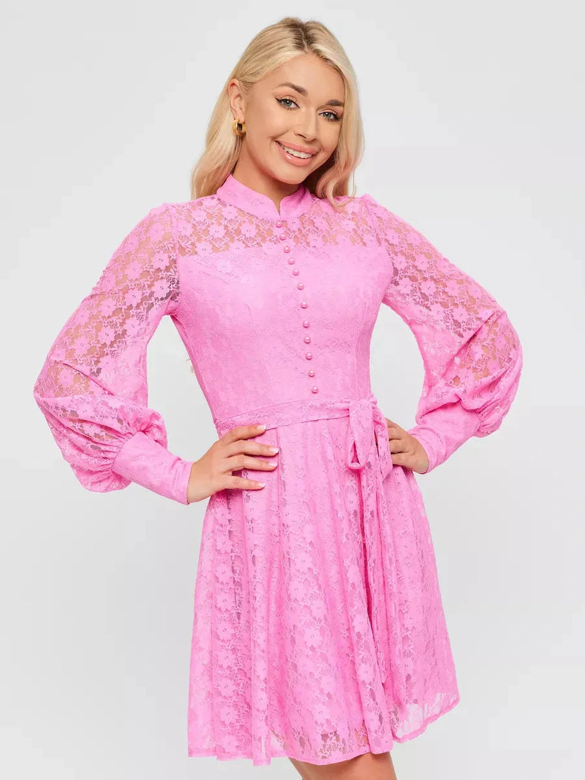 Step into sophistication with the Blush Mini Dress, crafted from luxurious lace fabric in a delicate pink hue. This dress is designed to make you shine at any special occasion, featuring intricate lace detailing and a fitted silhouette that flatters your figure. The elegant pearl-like buttons running down the front and on the cuffs add a refined touch, perfect for cocktail parties, weddings, or festive gatherings.