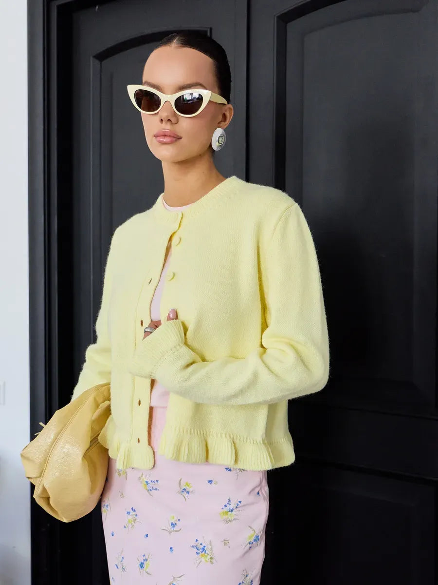 This elegant cardigan features delicate ruffled details and a straight cut silhouette, creating a feminine and refined look. The cropped length with stylish button closures adds a polished touch, making it ideal for office wear, school events, or casual outings. The vibrant yellow hue injects a fresh and joyful vibe into any wardrobe.