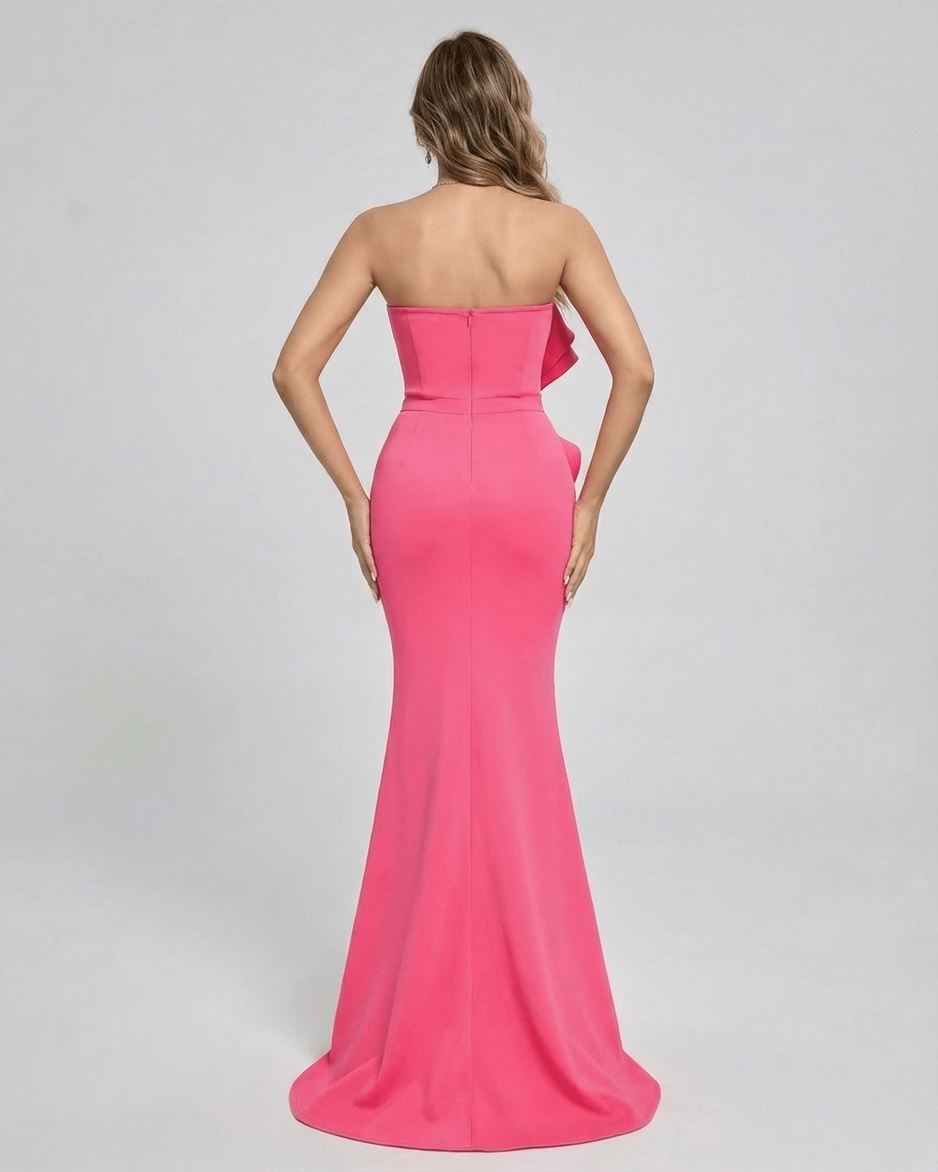 The strapless design is highlighted by a striking ruffled accent cascading along the side, adding dimension and sophistication. A concealed back zipper ensures seamless closure, while the natural waistline creates a flattering, form-fitting profile.