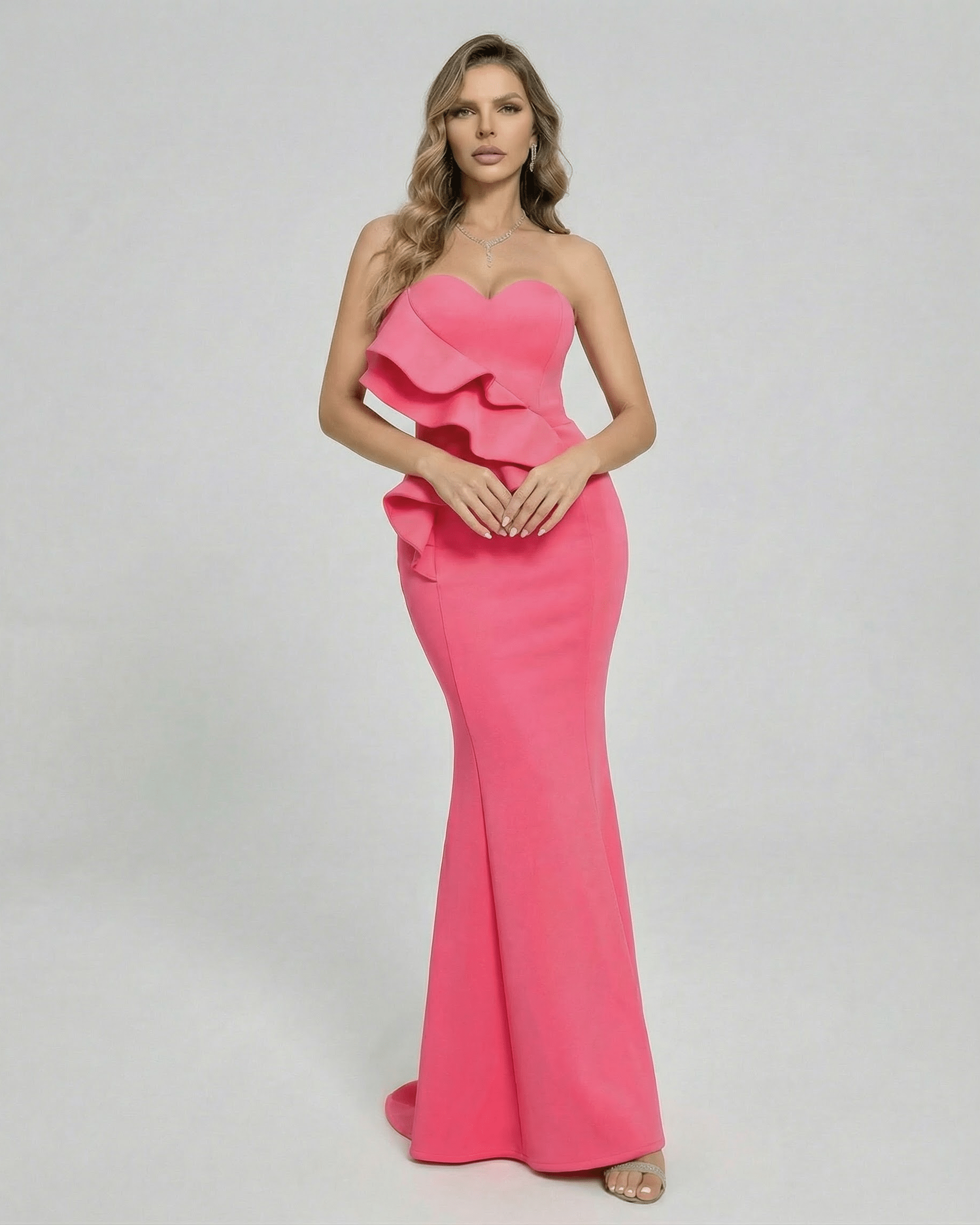 Crafted from high-quality polyester, this Celeste Maxi Dress features a vibrant pink hue that radiates modern luxury. The smooth fabric offers a slight stretch for a refined, comfortable fit, while the sleek trumpet silhouette enhances elegance for any special occasion.