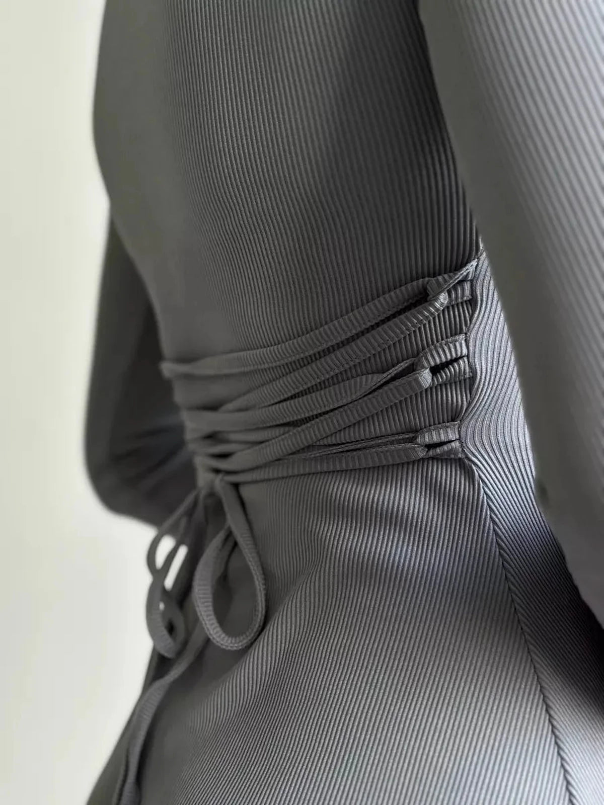 Designed with long flared sleeves and an adjustable lace-up tie closure at the back, the dress offers a comfortable yet stylish fit. The raw-edge hems add a contemporary touch to the overall look, while the absence of pockets maintains its sleek and minimalist appeal.
