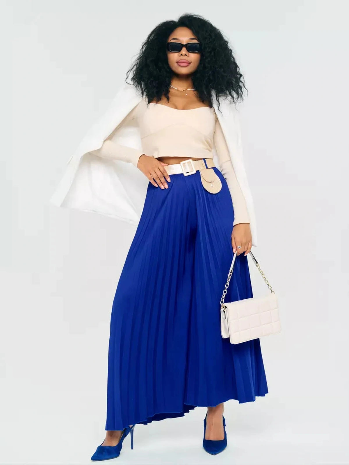 Elevate your wardrobe with the Celeste Pants, a stunning pair of wide-leg trousers designed to combine comfort and sophistication. Crafted from a luxurious fabric that holds its beautiful pleats, these pants offer a graceful flow and striking silhouette that moves effortlessly. The vibrant cobalt blue color adds a bold statement to your outfit, perfect for making an impression at any occasion.
