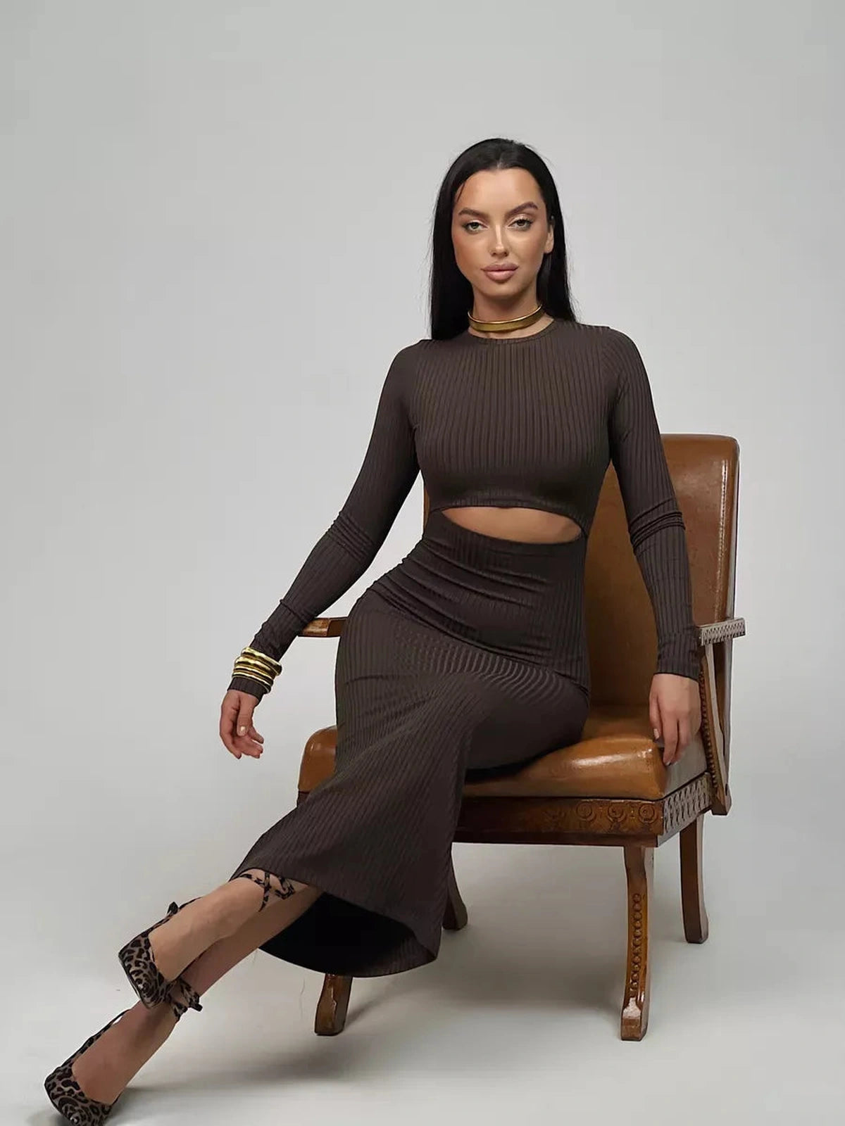 The long sleeves and slim fit silhouette create a versatile look ideal for spring and summer occasions, from casual outings to elegant evening events. The rich brown tone adds a warm, earthy touch, making this dress a timeless addition to any wardrobe. The breathable and elastic fabric ensures ease of movement and comfort throughout the day.