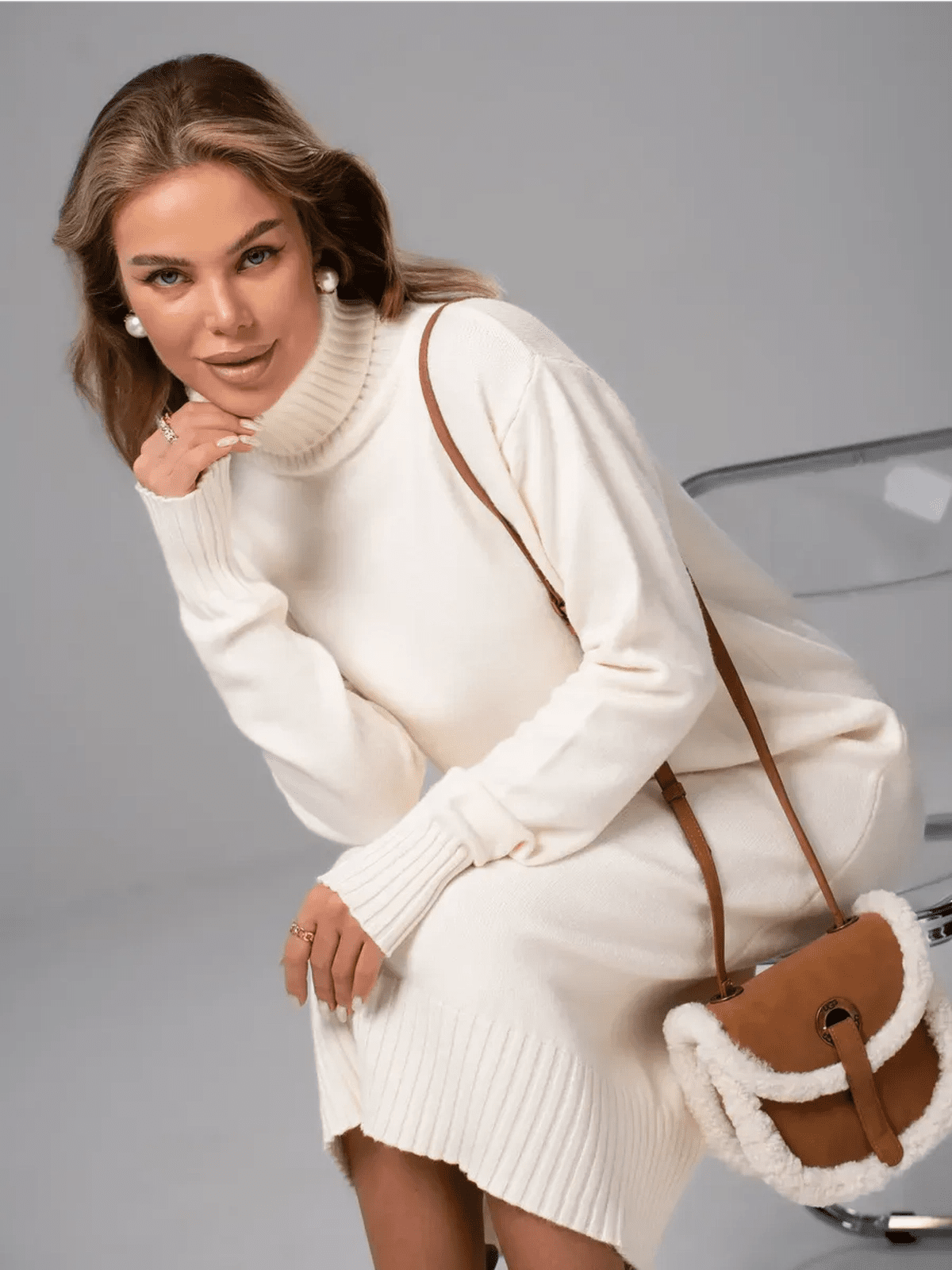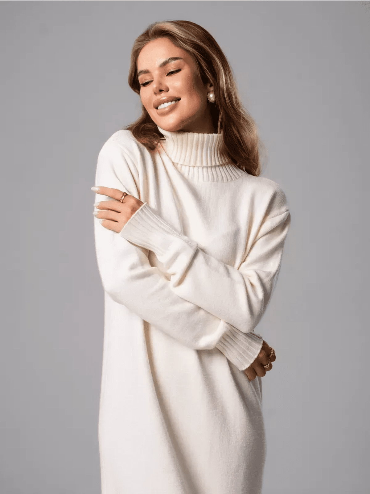 Whether paired with boots for a cozy day out or styled with a statement coat for evening events, the Elara Midi Dress combines functional warmth with timeless elegance. The soft white and milky tones add a fresh, clean touch to any wardrobe.