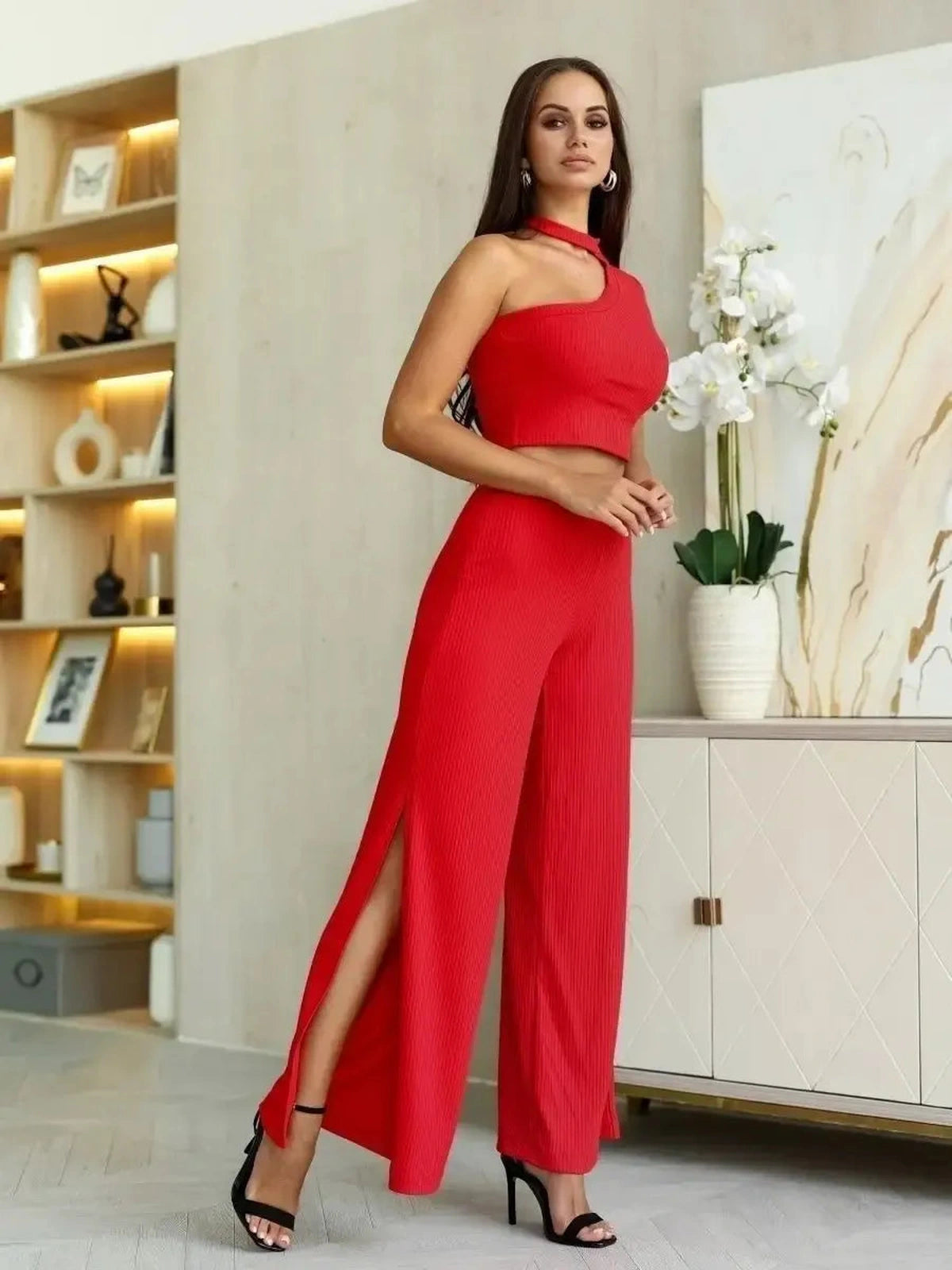 The wide-leg design features elegant side slits that add movement and a touch of allure, while the vibrant red color brings boldness and energy to your wardrobe. These trousers are an excellent choice for casual outings, home relaxation, or even light dancing activities.