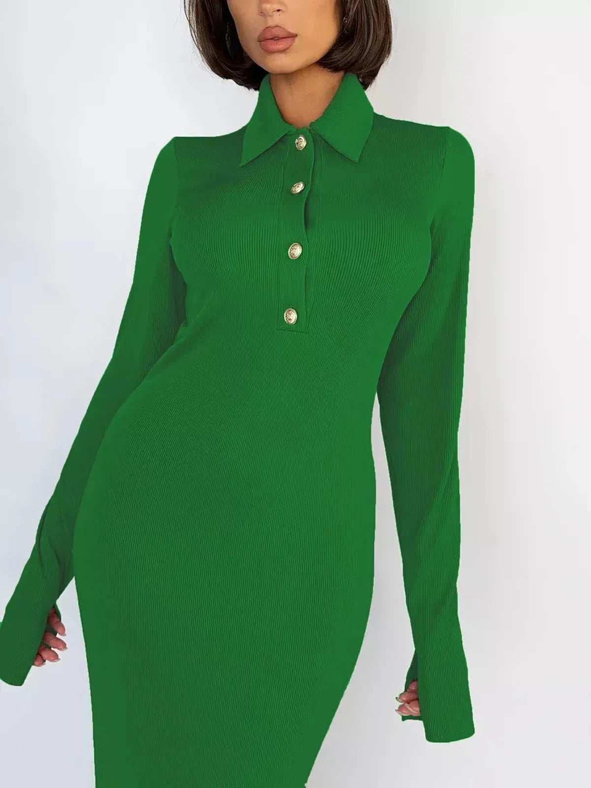 A deep V-neckline framed by a structured collar adds a polished touch while accentuating the décolleté with subtle allure. The row of glossy, gold-tone buttons elevates the look, introducing a luxurious finish that complements the rich color and soft drape of the fabric. Designed with long sleeves and a semi-fitted, gently contouring shape, this elegant long sleeve maxi dress maintains a perfect balance between minimalism and high-impact style.