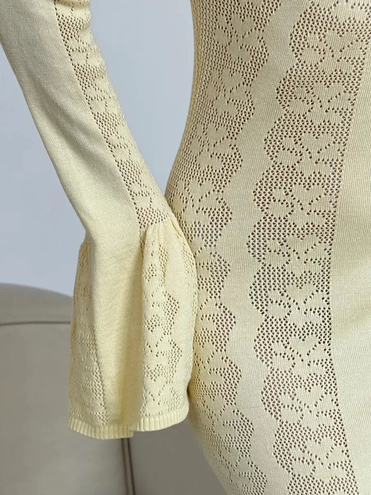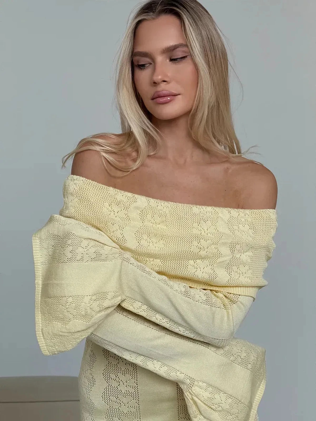 The dress showcases intricate textured knit patterns and a flattering boat neckline, accentuating the delicate contours of the neck and shoulders. A subtle side slit adds an alluring touch, while the creamy shade brings warmth and sophistication to your look, perfect for spring and summer occasions.