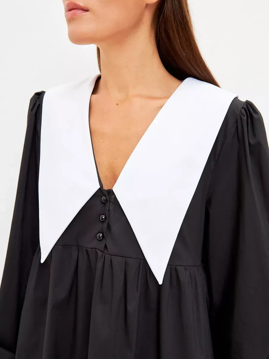 The Luna Mini Dress captures timeless elegance with a modern twist. Crafted from 100% breathable cotton, this black A-line silhouette flatters every figure with its effortless oversized fit and charming babydoll-inspired design. The striking white collar adds a sophisticated contrast, perfect for creating a polished yet playful statement look.