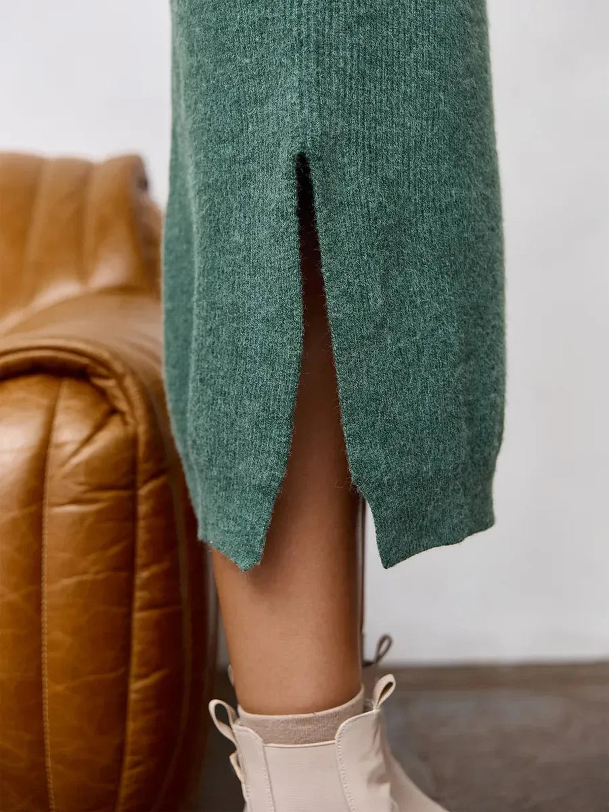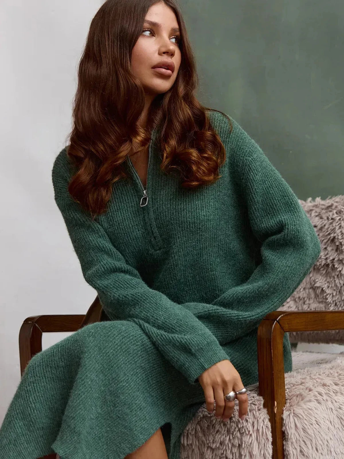 Stay warm and stylish this season with the Mira Midi Dress, an oversized ribbed knit dress crafted from a soft wool-acrylic blend that provides both comfort and insulation. This versatile dress is designed with a high stand collar and a practical zipper closure, perfect for adjusting your look throughout the day. The rich forest green color adds a fresh, elegant touch to your fall and winter wardrobe.