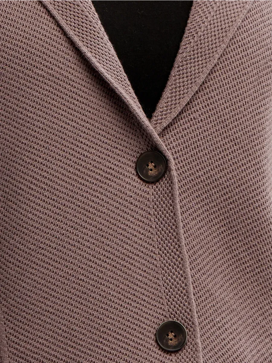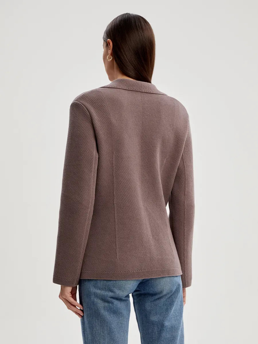 The blazer features a unique diagonal knit texture reminiscent of classic tweed, adding subtle depth without bulk. Its unlined design and button closure provide breathable comfort and timeless style, ideal for layering across seasons.
