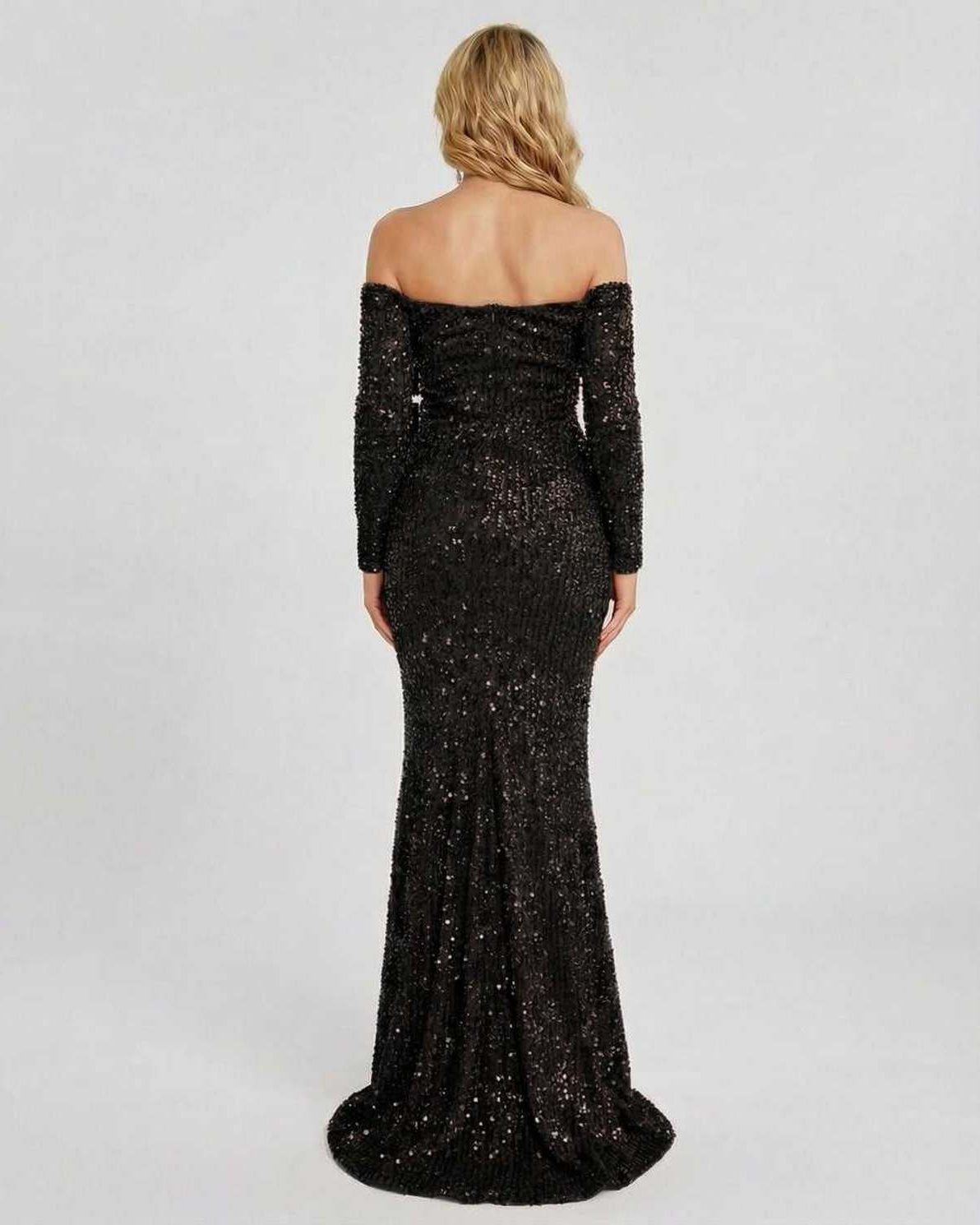 Discover the timeless elegance of the Noir Maxi Dress, a stunning floor-length gown crafted from premium sequin fabric. This exquisite black maxi dress features a sleek A-line silhouette with a graceful sweep train that adds sophistication and drama. The shimmering sequins create a luxurious finish perfect for formal evenings and special events.