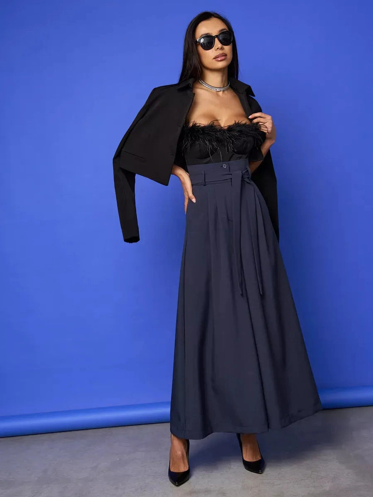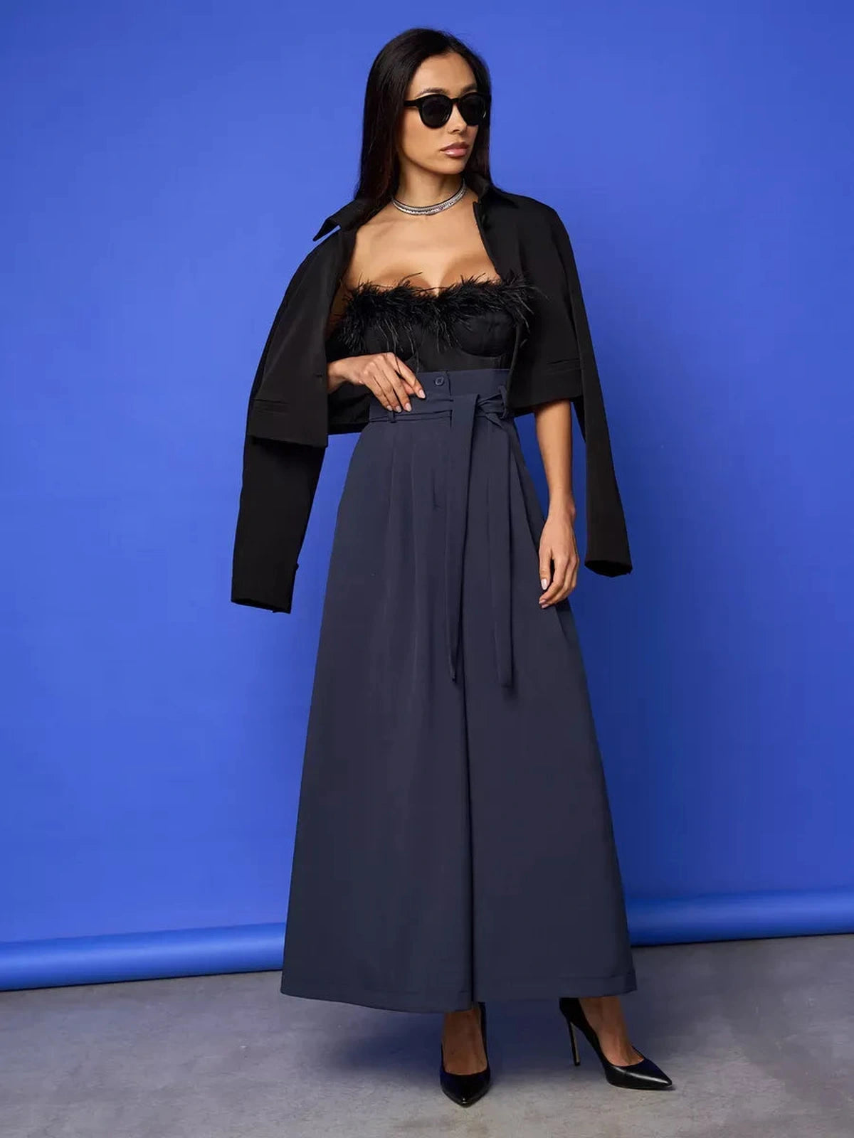 Step into timeless elegance with the Orion Pants, a refined pair of women's palazzo trousers designed for style and comfort. Featuring a high waist and an included fabric belt, these dark navy pants offer a flattering silhouette that enhances your figure while providing freedom of movement. Crafted from a luxurious blend of viscose and polyester, they ensure softness and durability, perfect for year-round wear.