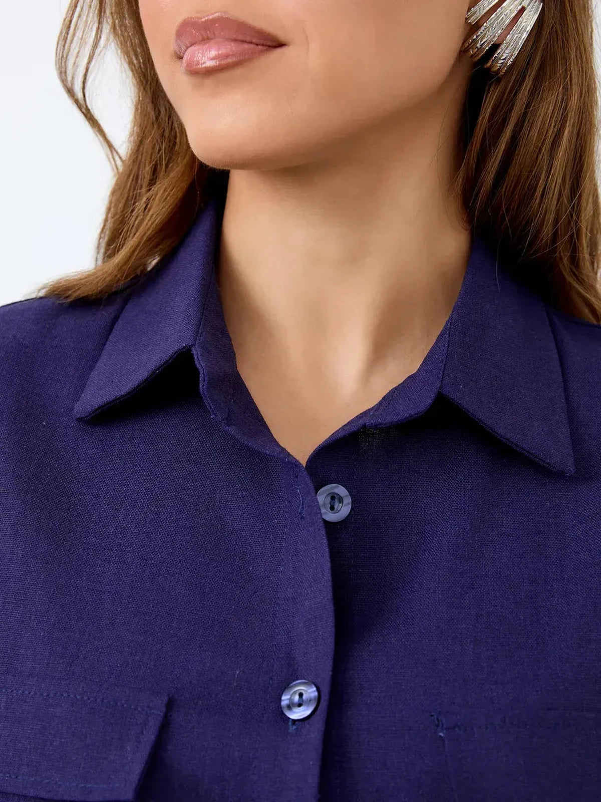 Introducing the Sapphire Midi Dress, a chic and versatile linen shirt dress designed for women who appreciate both elegance and comfort. Crafted from a premium fabric blend of 40% linen, 57% viscose, and 3% elastane, this dark blue midi dress offers breathable, lightweight wear perfect for warm spring and summer days, as well as early autumn.