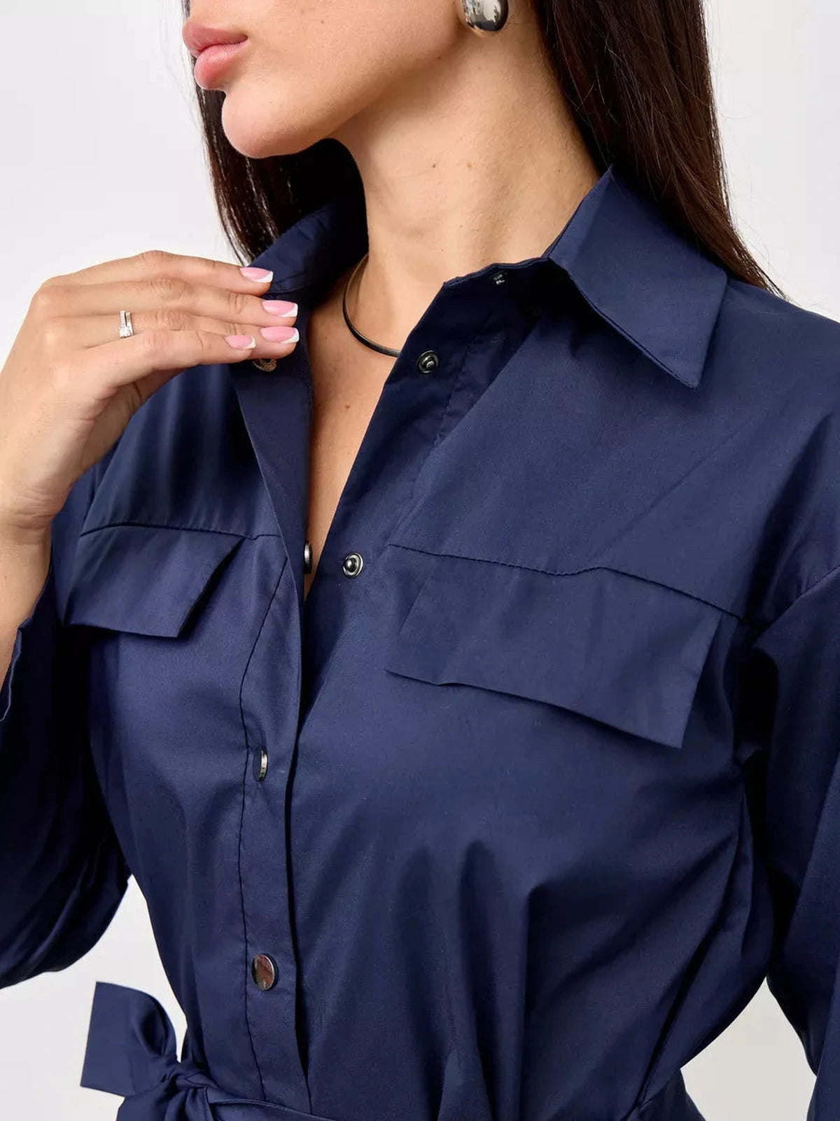 Introducing the Selene Midi Dress, a timeless and elegant shirt dress crafted from a smooth blend of 90% cotton and 10% viscose. This navy blue midi dress features a relaxed yet flattering silhouette designed for all body types. The lightweight, wrinkle-resistant fabric ensures comfort and ease throughout the day, while high-quality metallic snap buttons provide a chic finishing touch.