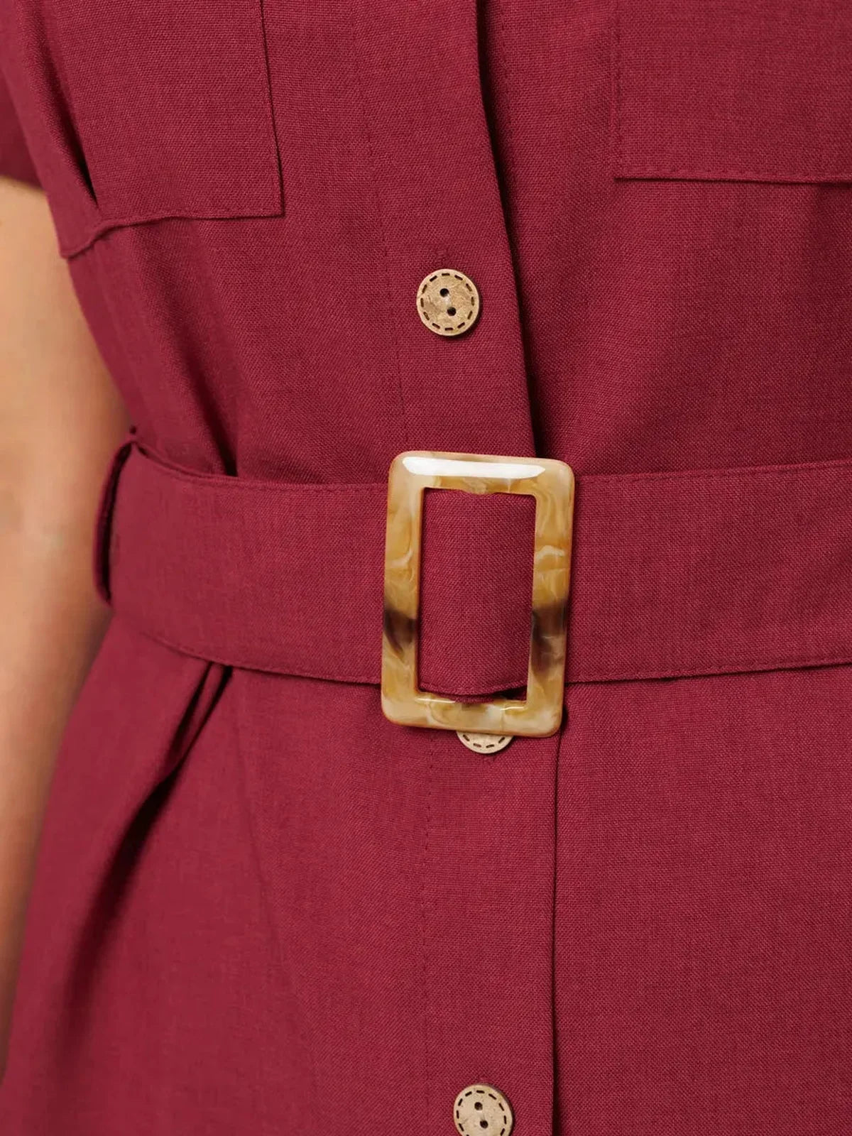 Designed with flap chest pockets, side pockets, and a structured shirt collar, the Sena Midi Dress offers versatile style for various occasions. The rich burgundy shade adds a touch of sophistication, making it ideal for office settings, casual outings, or festive events.