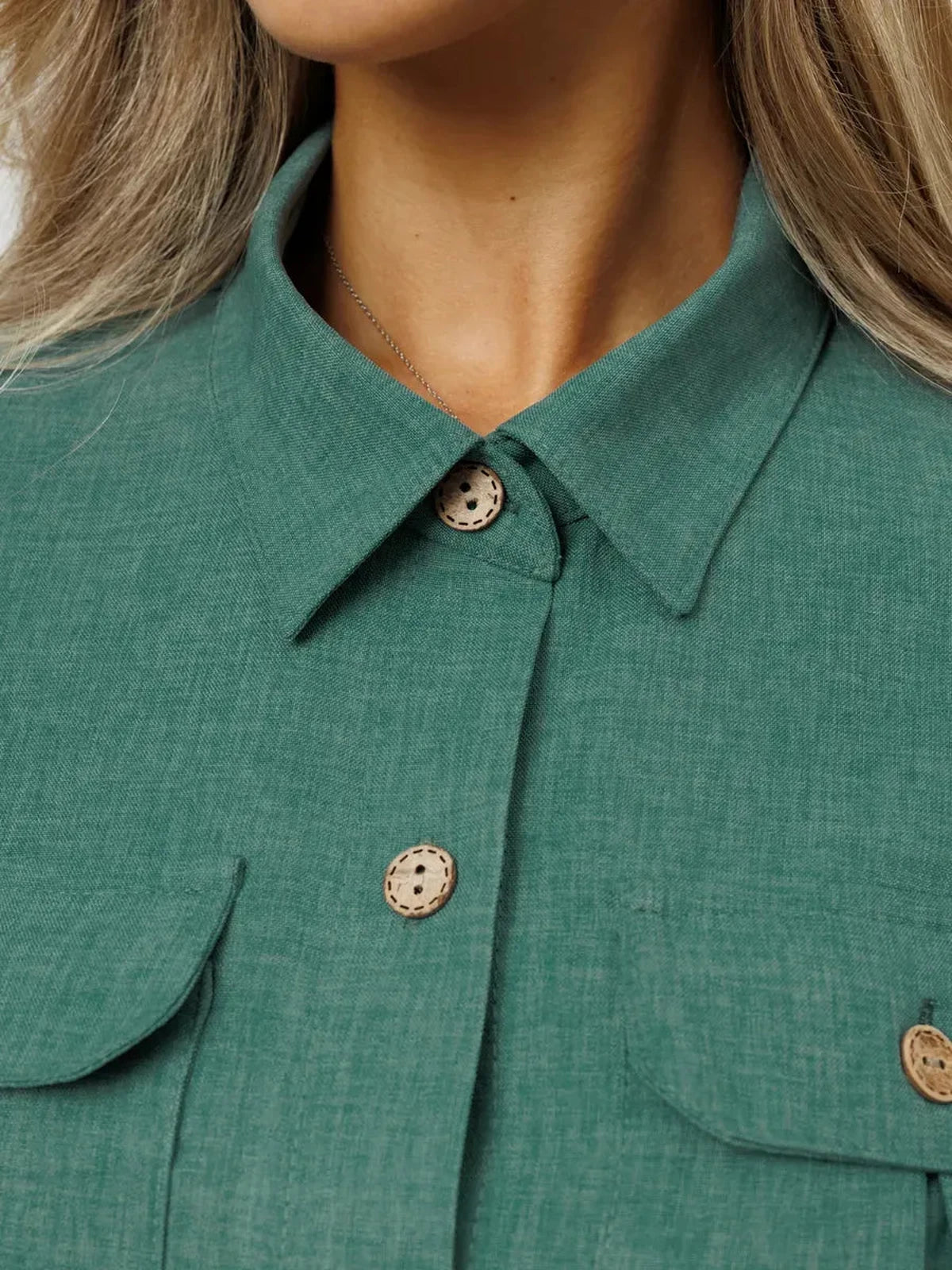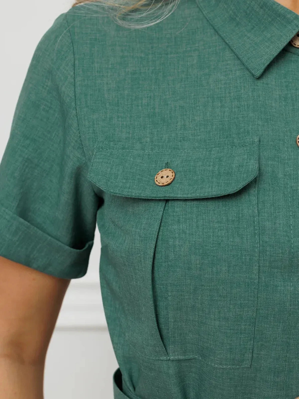 Featuring flap chest pockets, side pockets, a structured shirt collar, and short rolled sleeves with cuffs, the Sera Midi Dress is perfect for office wear, casual outings, and special occasions. The soft sage green hue adds understated elegance to your wardrobe.