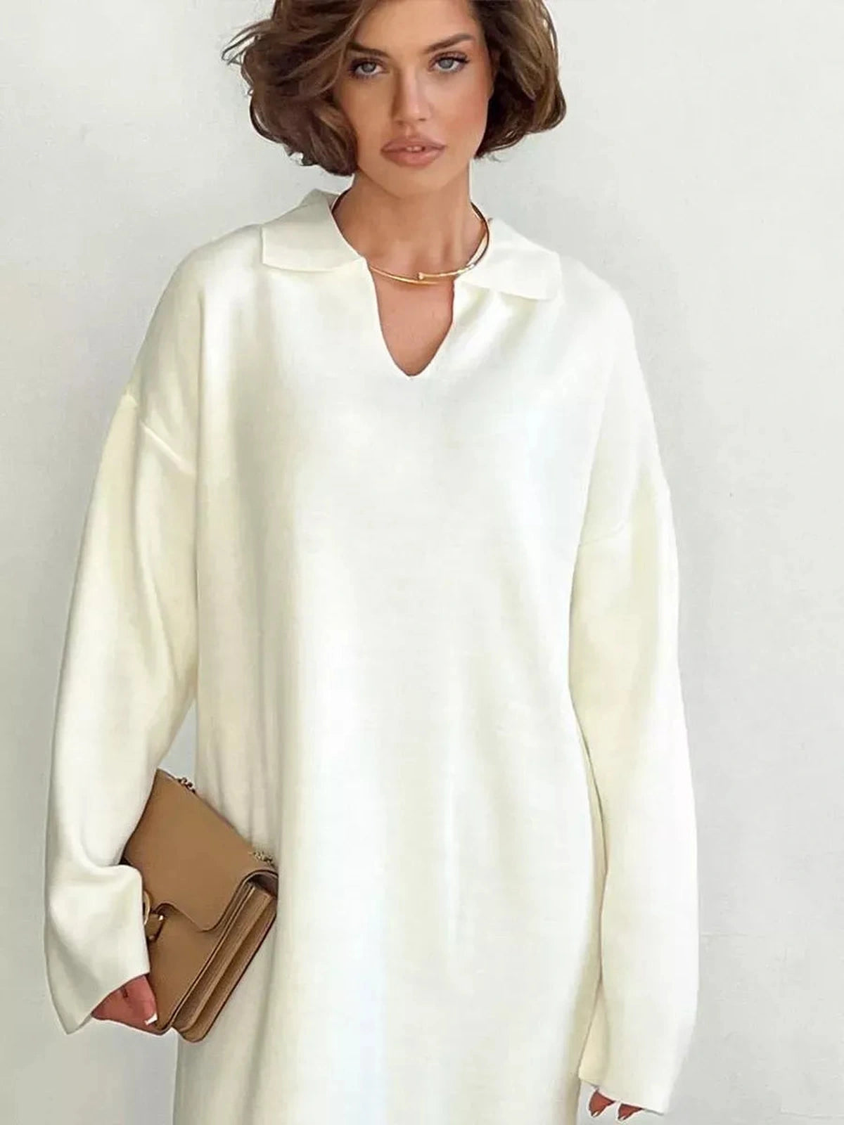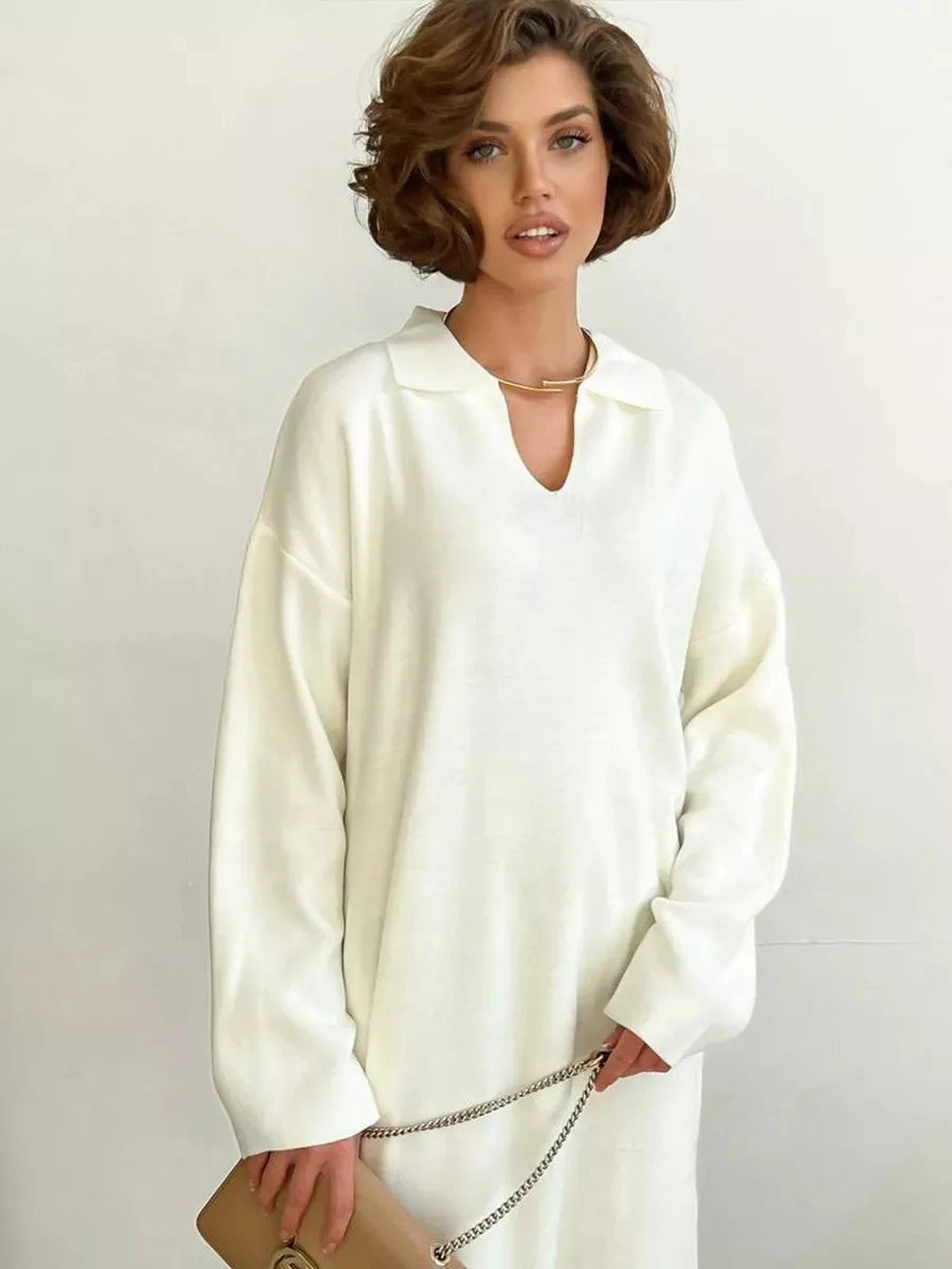 Experience luxurious comfort and timeless style with the Seren Midi Dress, crafted for modern women who seek elegance and ease in their wardrobe. This sophisticated knit midi dress features an oversized fit with a delicate V-neck collar, making it an ideal choice for cooler seasons. The Seren Midi Dress blends premium acrylic and cotton fabric to deliver warmth and softness, perfect for everyday wear or office settings.