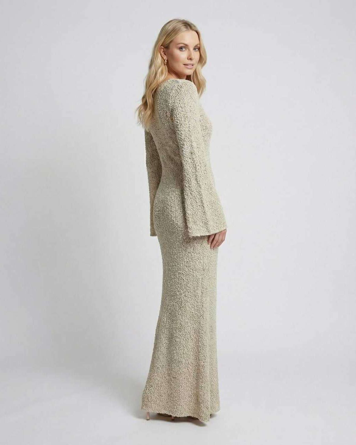 The Sienna Maxi Dress is a refined maxi sweater dress crafted in a soft beige knit with a sculpted bodycon silhouette. Designed with a high waist and floor-length hem, this long sleeve maxi dress offers a streamlined profile while maintaining fluid movement. The textured acrylic knit delivers dimension and subtle structure, making it a versatile choice for transitional and cool-weather styling.