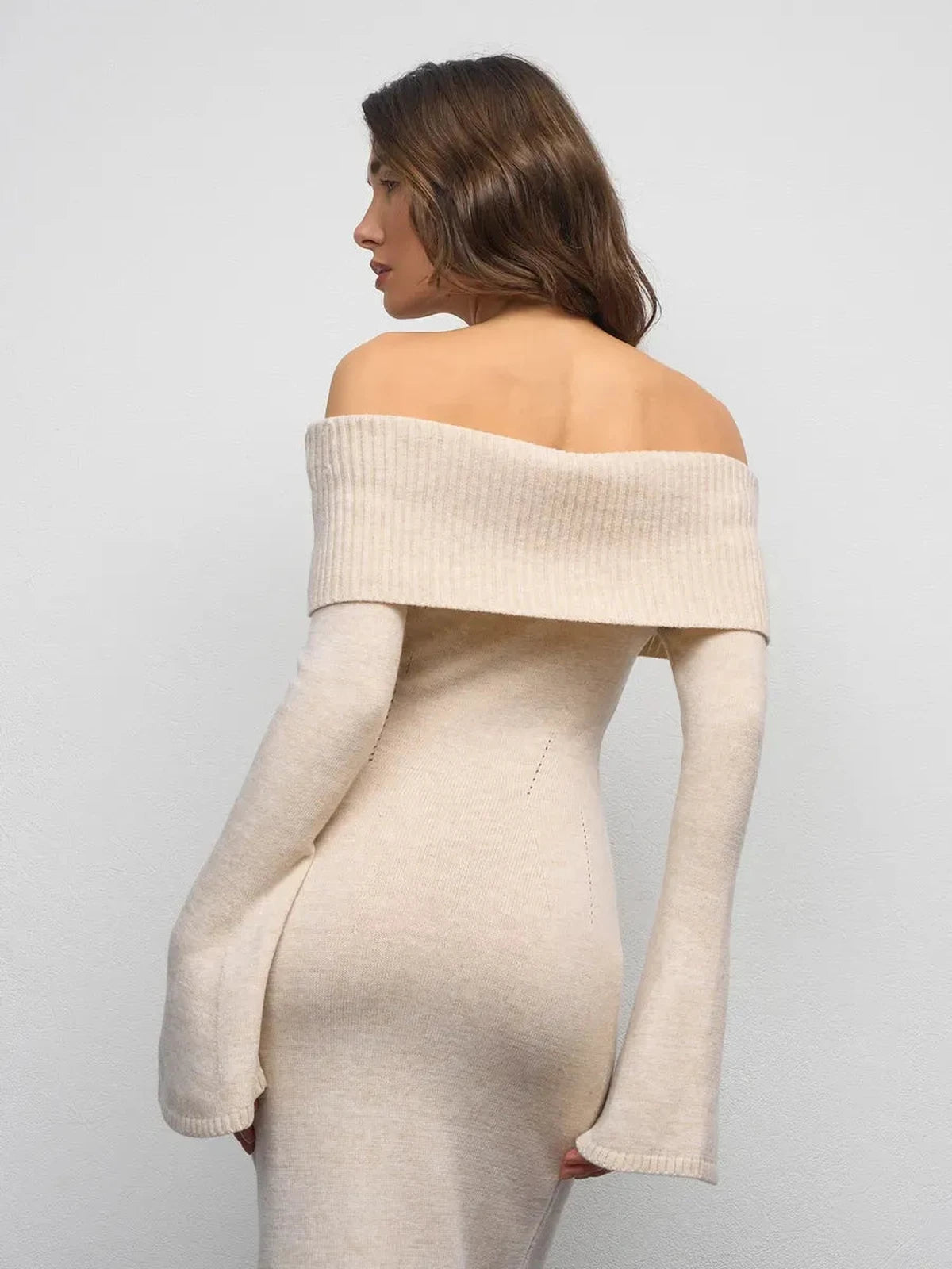The Sienna Maxi Dress offers a cozy yet sophisticated knitwear option crafted from a premium blend of acrylic, wool, and elastane. Presented in a warm beige tone, this maxi dress showcases an off-shoulder neckline with a fold-over collar, paired with flared long sleeves for a contemporary, elegant silhouette.