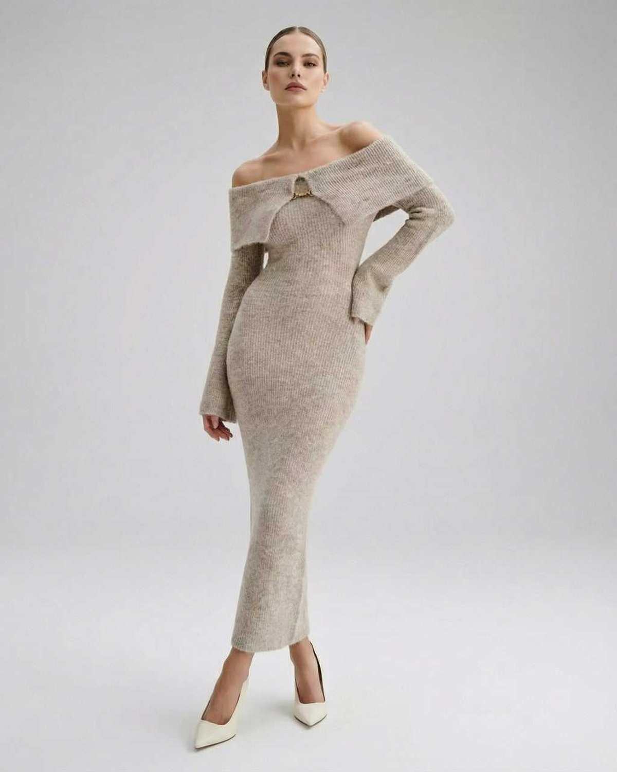 The Sienna Midi Dress redefines modern sophistication with its sculpting silhouette and refined texture. Designed as a women’s off shoulder knit midi dress, this piece blends elevated minimalism with a confident, feminine edge. The ribbed bodycon fit enhances natural curves while maintaining effortless comfort.