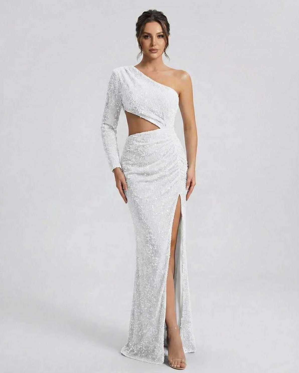 The dress showcases an asymmetrical one-shoulder neckline with a full-length sleeve, paired with an empire waistline and a tasteful side cutout that adds a contemporary edge. A thigh-high slit enhances movement and allure, while a hidden zipper closure ensures a smooth, polished finish.
