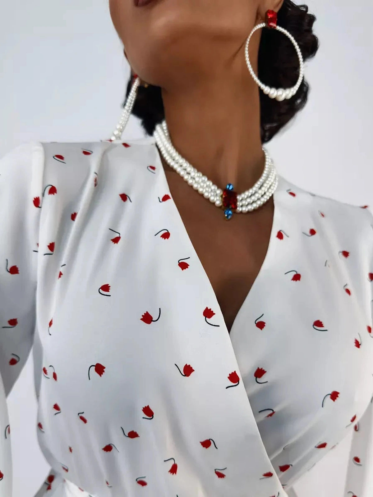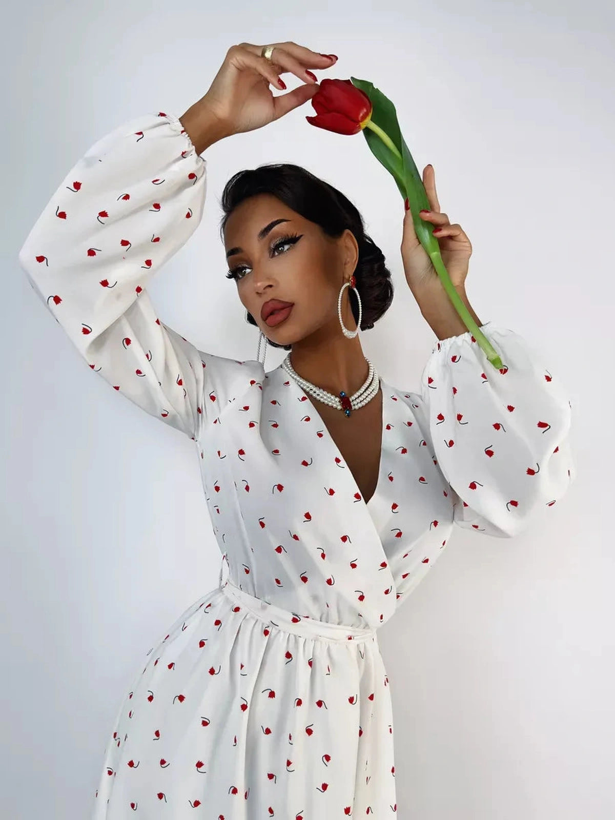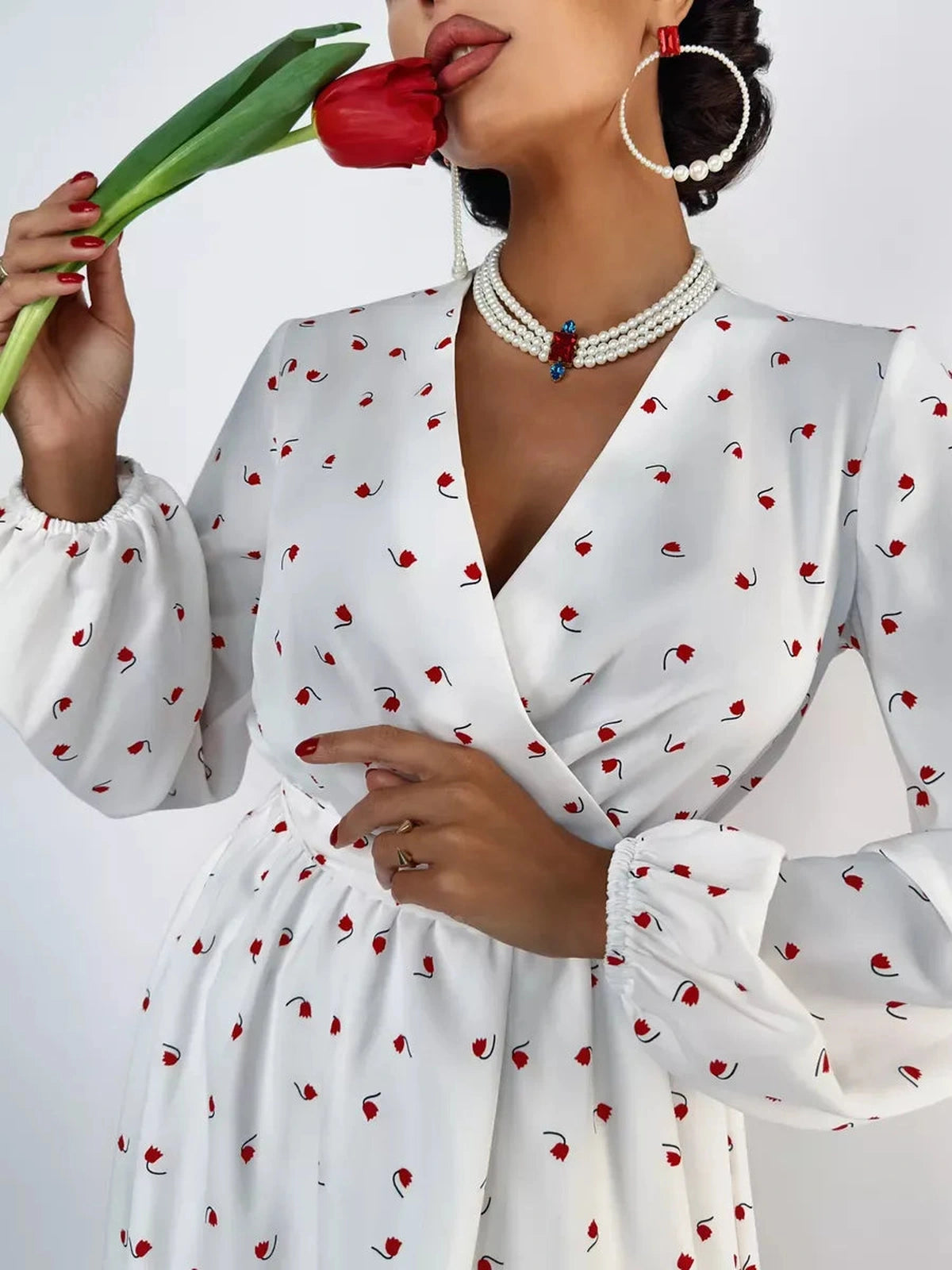 Discover the Tulip Mini Dress, crafted from a soft, breathable blend of polyester, viscose, and elastane. Featuring a pristine white base adorned with delicate red floral prints, this mini dress offers a flattering V-neckline and a smooth, polished finish that elevates its luxurious appeal. The lightweight fabric ensures comfort and ease throughout the day.