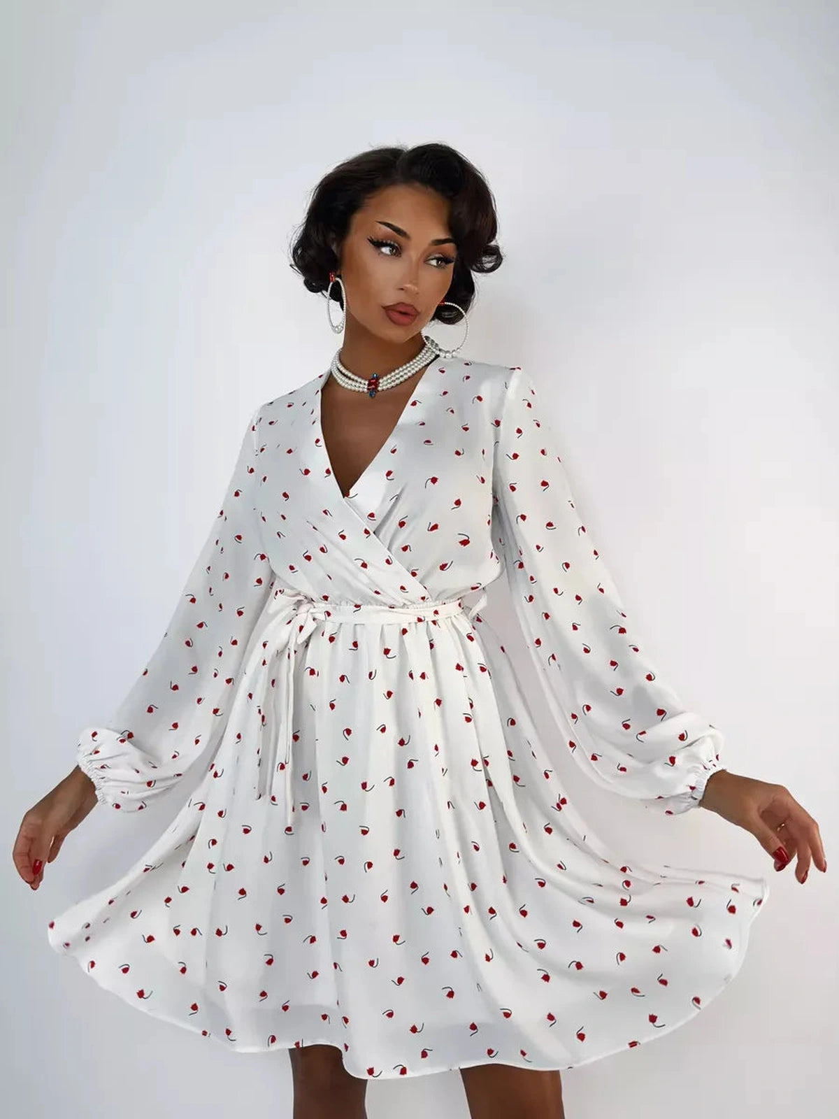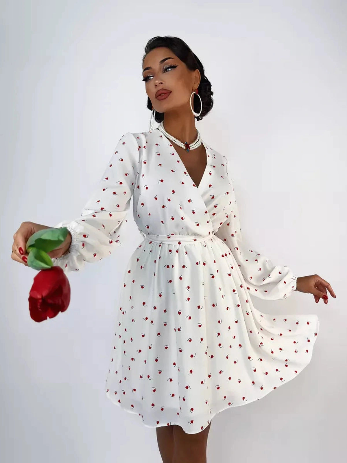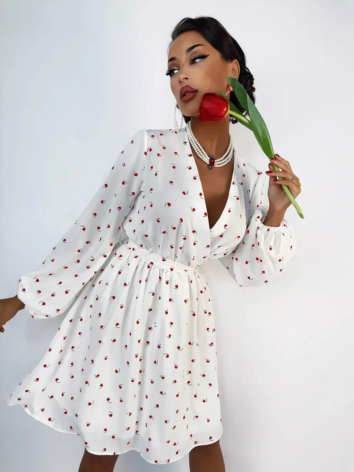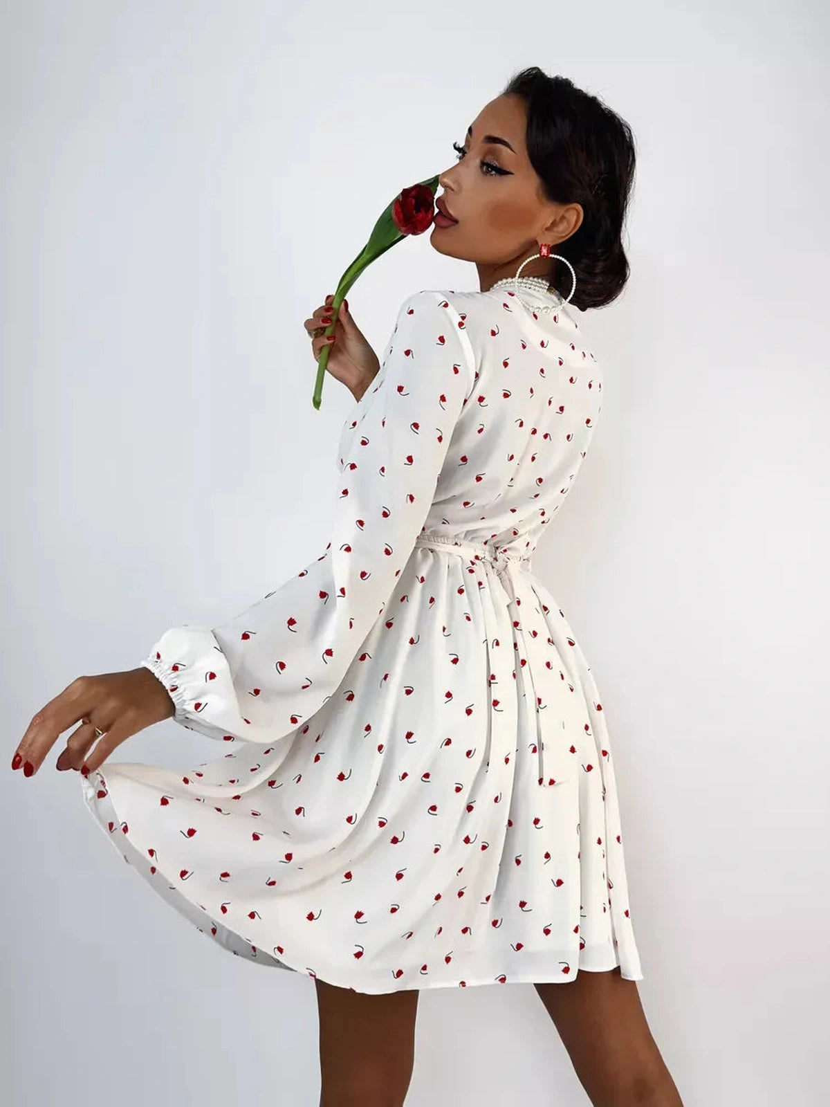 Discover the Tulip Mini Dress, crafted from a soft, breathable blend of polyester, viscose, and elastane. Featuring a pristine white base adorned with delicate red floral prints, this mini dress offers a flattering V-neckline and a smooth, polished finish that elevates its luxurious appeal. The lightweight fabric ensures comfort and ease throughout the day.
