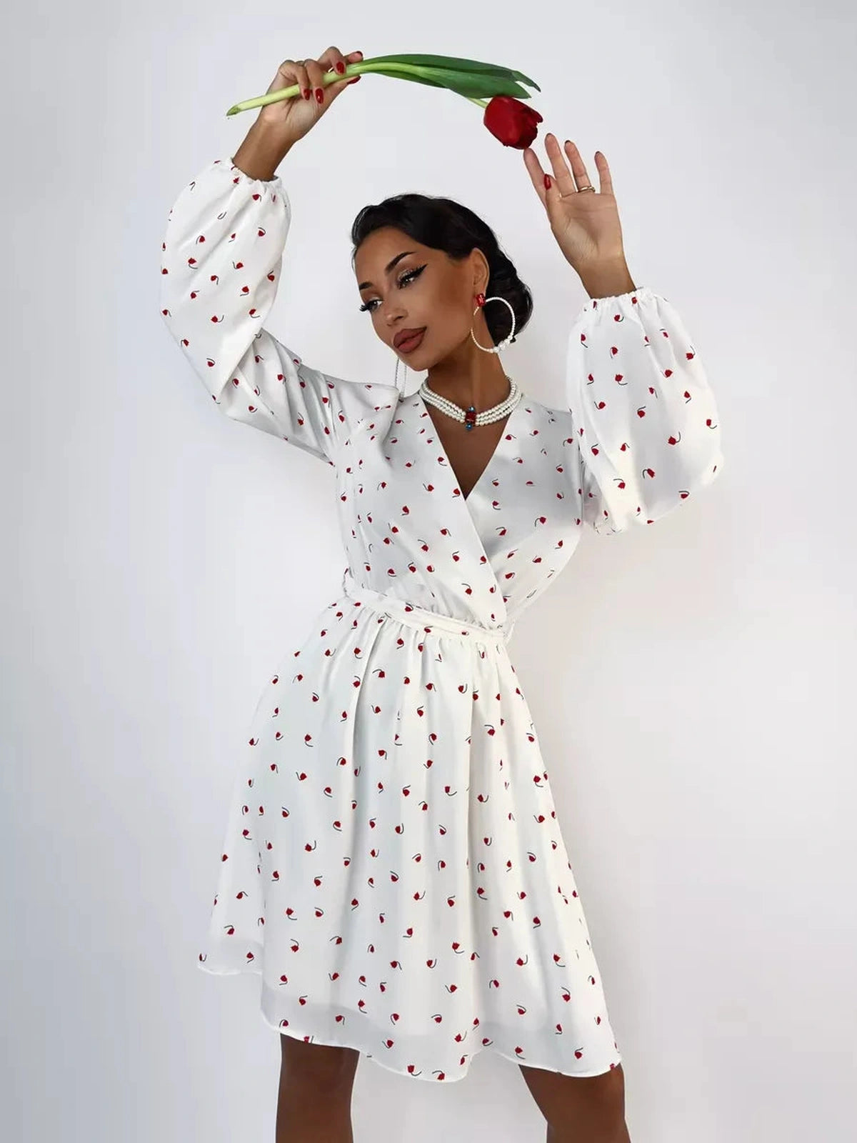 This dress boasts a tailored silhouette with a wrap-style bodice and an adjustable waist tie that enhances fit versatility. The long puff sleeves gathered at the wrists add a romantic and refined touch, while the absence of pockets and zippers maintains a clean, uninterrupted line. Designed without lining, the dress offers a breathable wear experience suitable for various seasons.