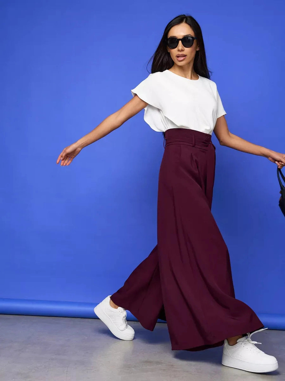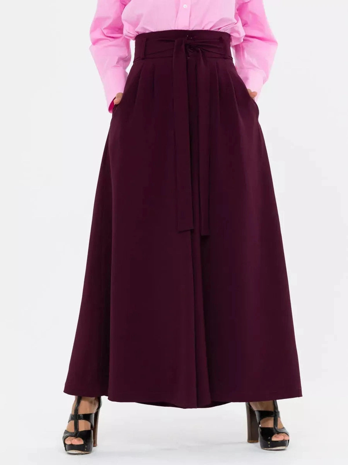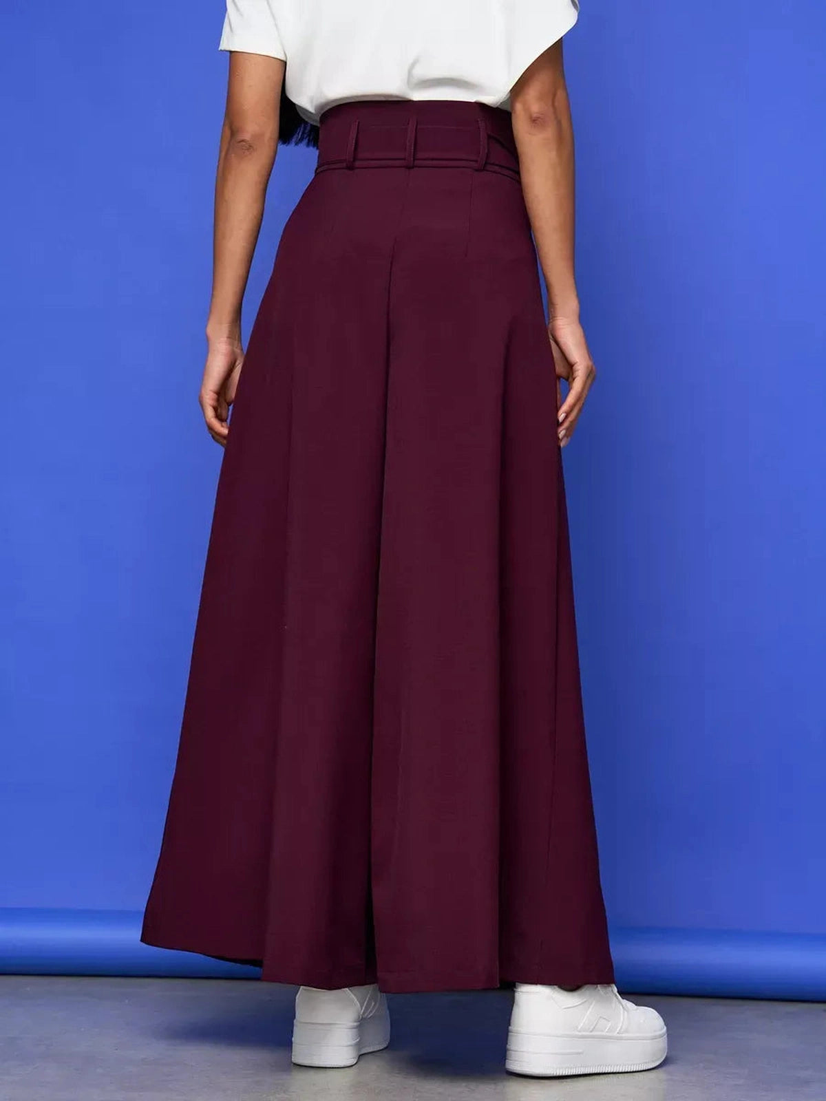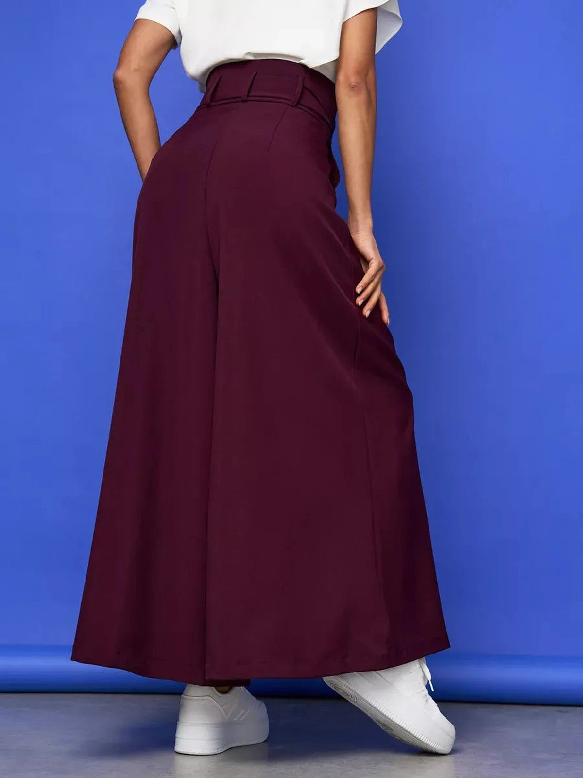 Introducing the Veda Pants, a refined and elegant addition to your wardrobe. These women's wide-leg palazzo trousers feature a high waist with an included fabric belt to define your silhouette beautifully. Crafted from a quality blend of viscose and polyester, these wine red pants offer both comfort and a smooth drape, perfect for year-round wear.