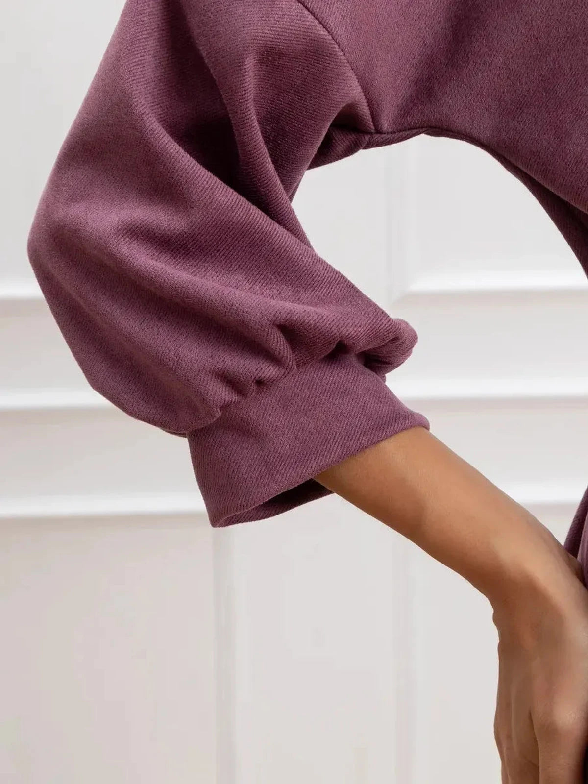 Made from a premium blend of viscose, cotton, and elastane, the dress features a plush, velvety texture with light stretch for comfortable wear throughout the year. The round neckline and easy drape are complemented by a fabric belt that allows optional waist definition, while the subtle side slit adds contemporary flair and ease of movement.