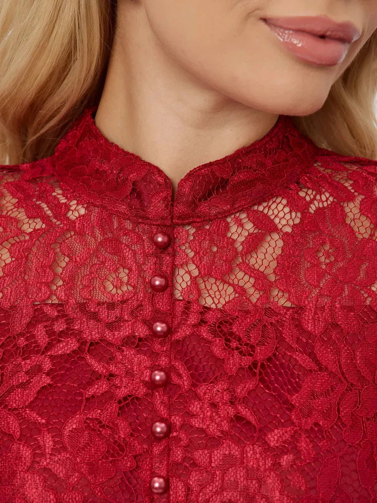 The dress showcases beautiful balloon sleeves with wide cuffs and delicate pearl-like buttons running along the front, adding an elegant decorative touch. A refined stand collar frames the neckline, lending an aristocratic charm to this already stunning piece. The intricate lace overlay subtly reveals the skin beneath, creating an alluring yet tasteful look.