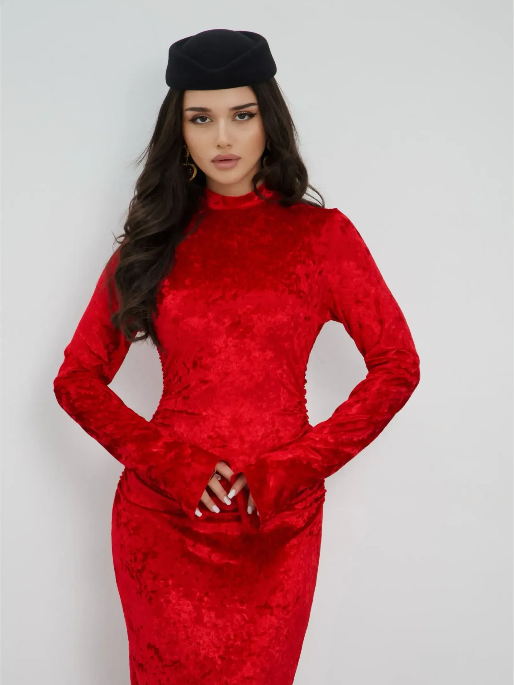 Step into the spotlight with the Vesta Midi Dress, a luxurious velvet gown designed for women who desire sophistication and allure at any special occasion. This stunning red dress features a fitted silhouette that beautifully sculpts the body, enhanced by subtle ruching and a graceful high neckline for timeless elegance.