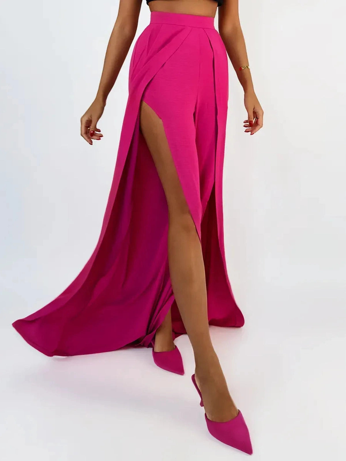 Experience bold elegance with the Viora Pants, designed to empower women with a blend of style and comfort. These wide-leg palazzo trousers feature a high waist that beautifully sculpts the silhouette, providing an elongated and flattering effect. The daring front slits add a dramatic and sophisticated flair, perfect for making a statement at any event.