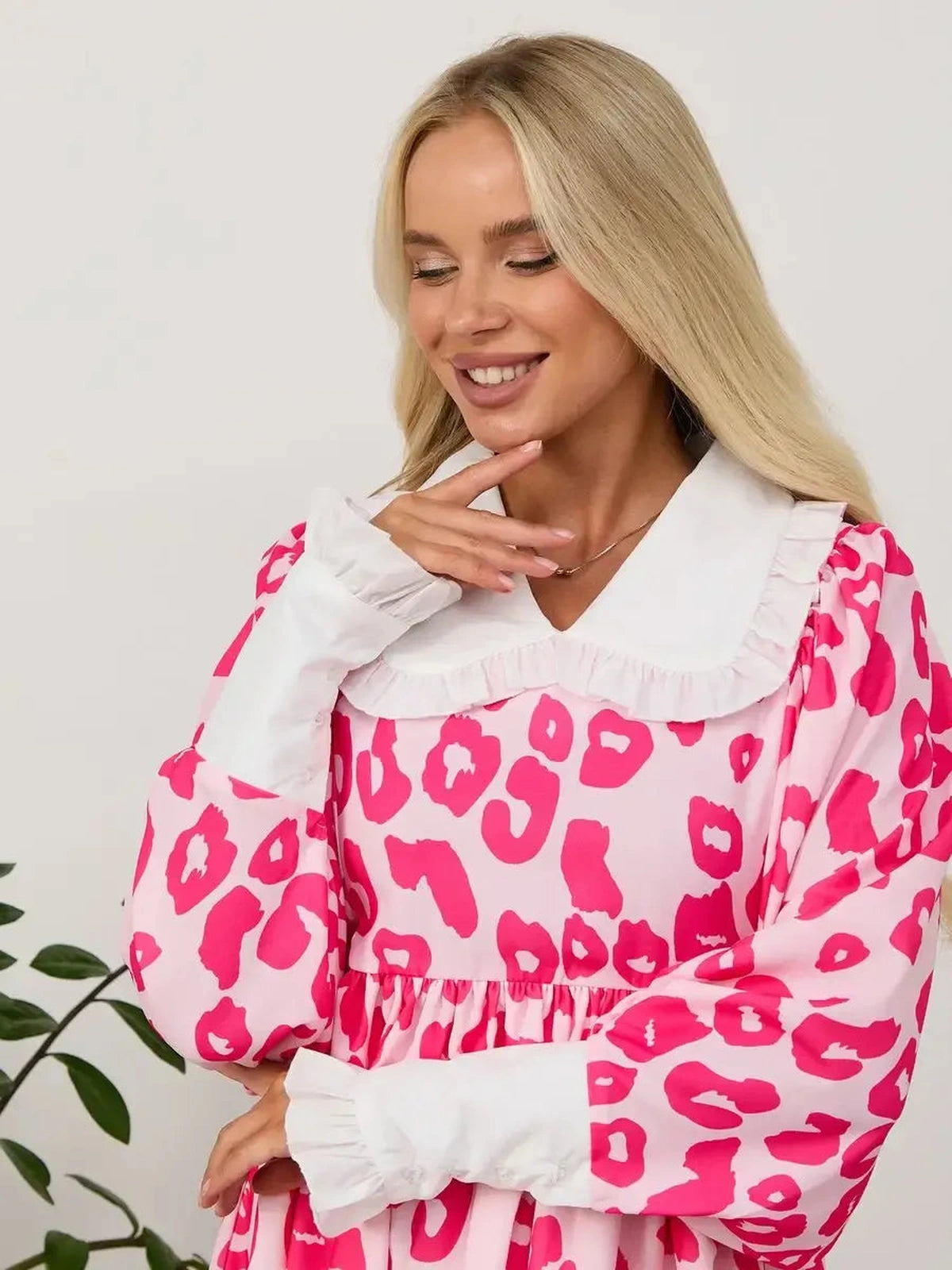 The Zella Mini Dress features a vibrant cotton-polyester blend fabric, adorned with striking bright pink and fuchsia leopard spots on a soft light blue base. This oversized baby doll silhouette offers a playful yet sophisticated look with a large white ruffled collar and contrasting white cuffs on long sleeves.