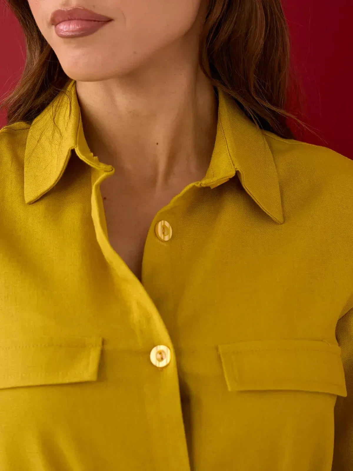 Zinnia Midi Dress — Stylish Mustard Linen-Cotton Shirt Dress with Belt