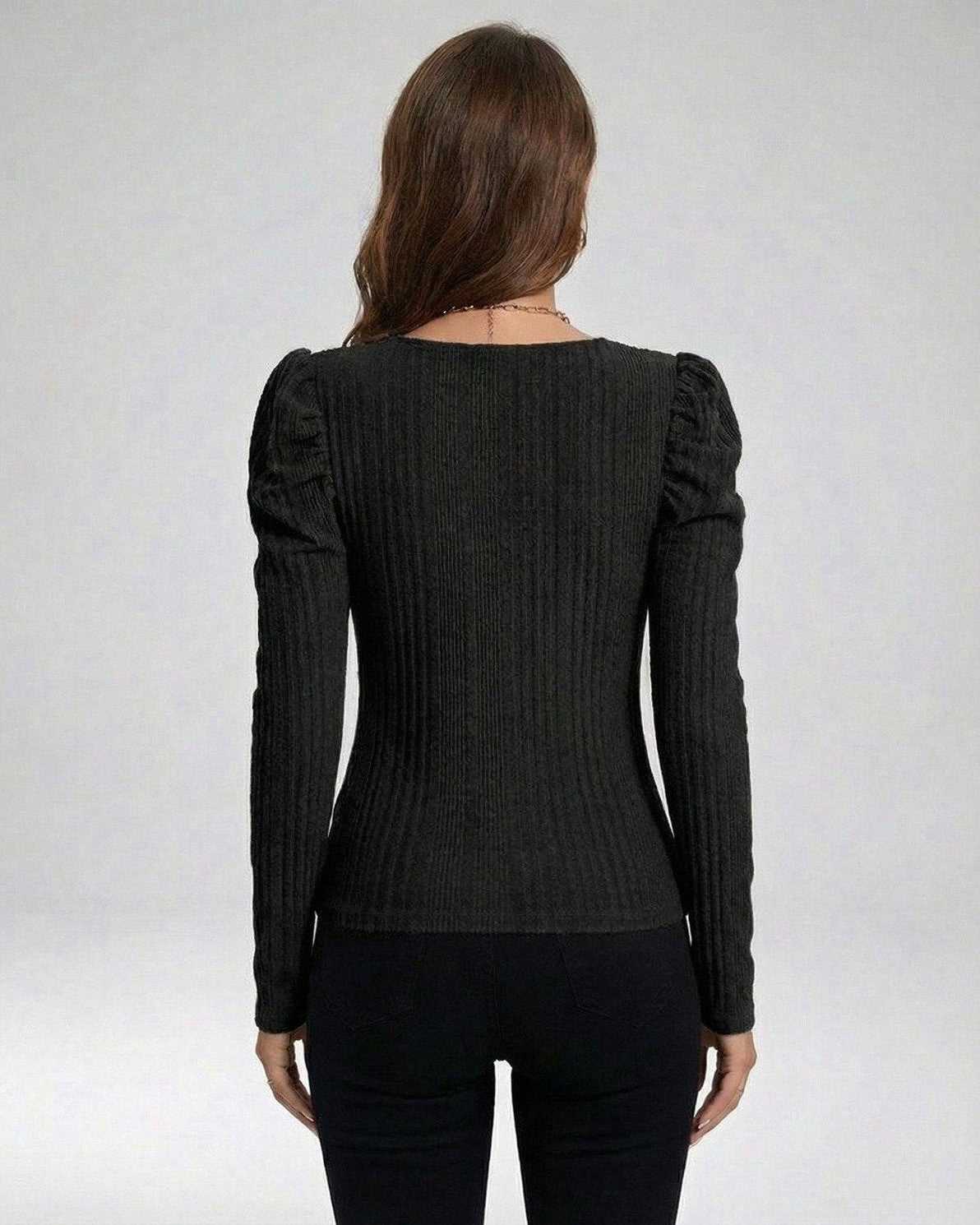 Com um decote quadrado estruturado e um detalhe subtil em entalhe, além de elegantes ombros franzidos, esta camisola de mangas compridas combina alfaiataria contemporânea com uma elegância intemporal. A camisola preta lisa cria uma peça base versátil que transita com facilidade do vestuário profissional para jantares.
