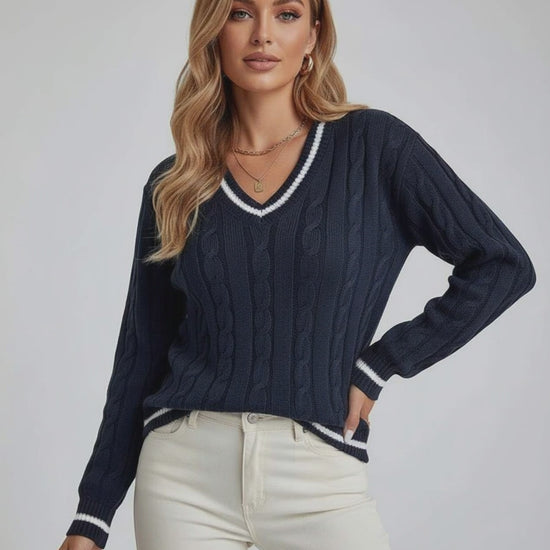 Adicione esta elegante camisola de malha com decote em V e padrão de trança à sua coleção para uma versatilidade pronta para a estação.