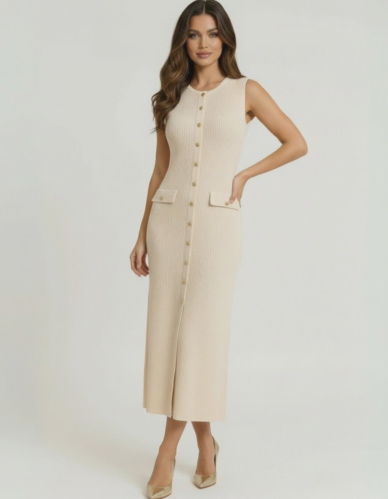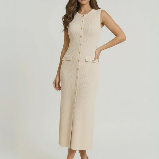 Finalizado com botões em tom dourado e bolsos com aba na cintura, este vestido midi sem mangas combina inspiração vintage com minimalismo contemporâneo. O seu tom bege neutro torna-o uma peça versátil para cocktail e uma escolha sofisticada para convidados de casamento, formaturas, brunches ou ocasiões noturnas.