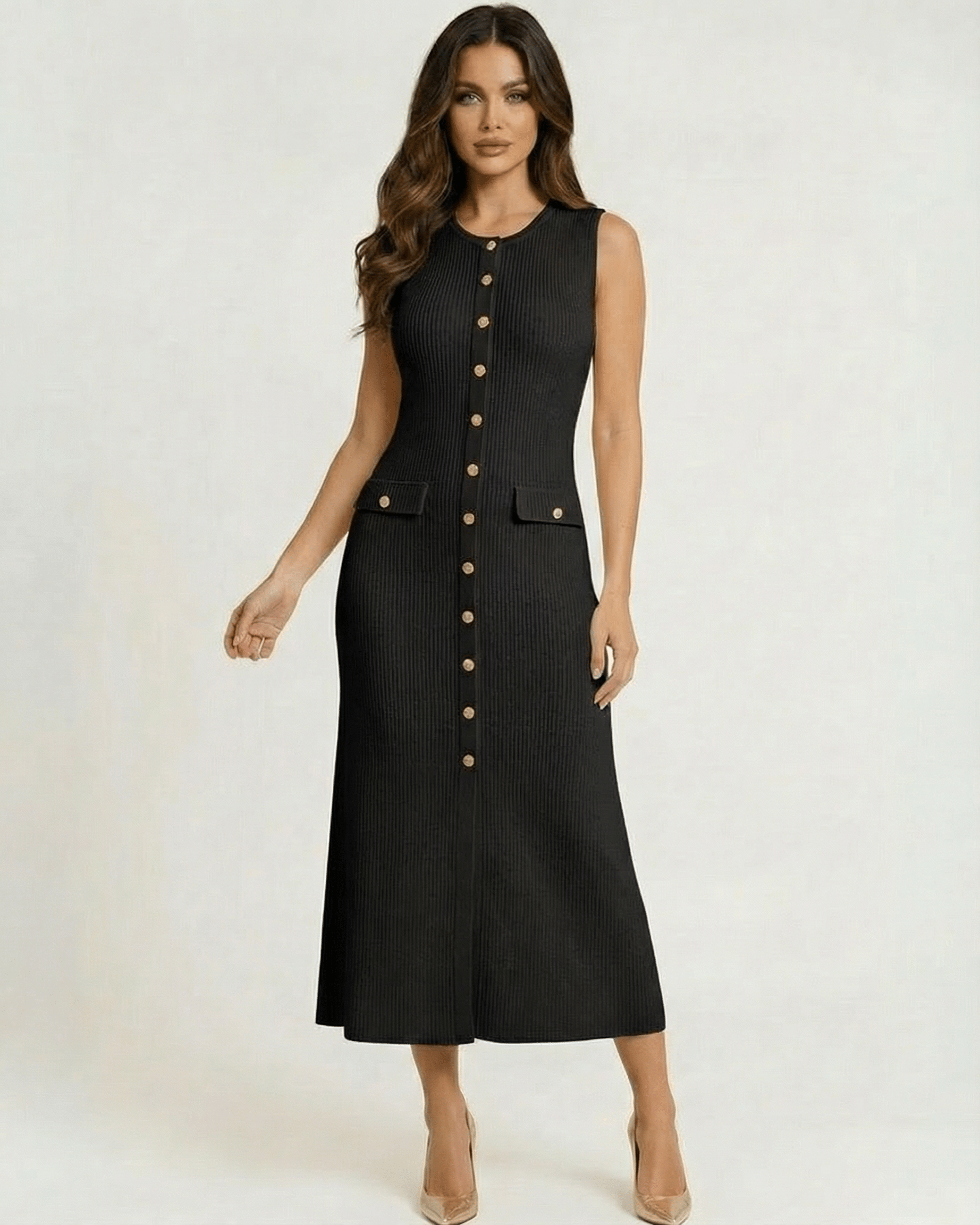 Finalizado com botões em tom dourado e bolsos com aba na cintura, este vestido midi sem mangas combina detalhes inspirados no vintage com minimalismo contemporâneo. O tom preto clássico faz dele o vestido midi ideal para cocktail e uma opção polida para convidados de casamento, formaturas, jantares ou ocasiões noturnas.