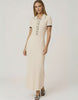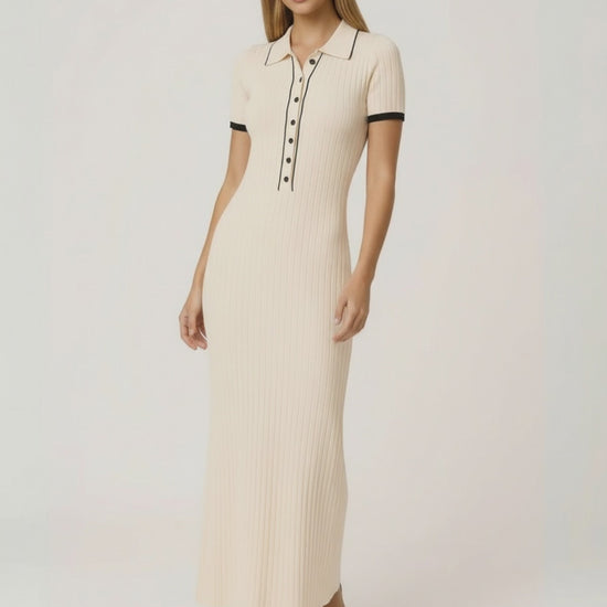 Desenhado com mangas curtas e acabamentos subtis em contraste na gola e nos punhos, este elegante vestido maxi equilibra minimalismo com detalhes precisos. As caneluras verticais realçam a estética elegante, e o corte ajustado mantém a estrutura sem rigidez. O tom bege neutro oferece versatilidade sem esforço, ideal tanto para um dia sofisticado como para uma noite requintada.