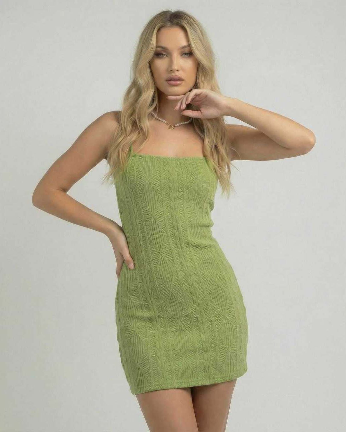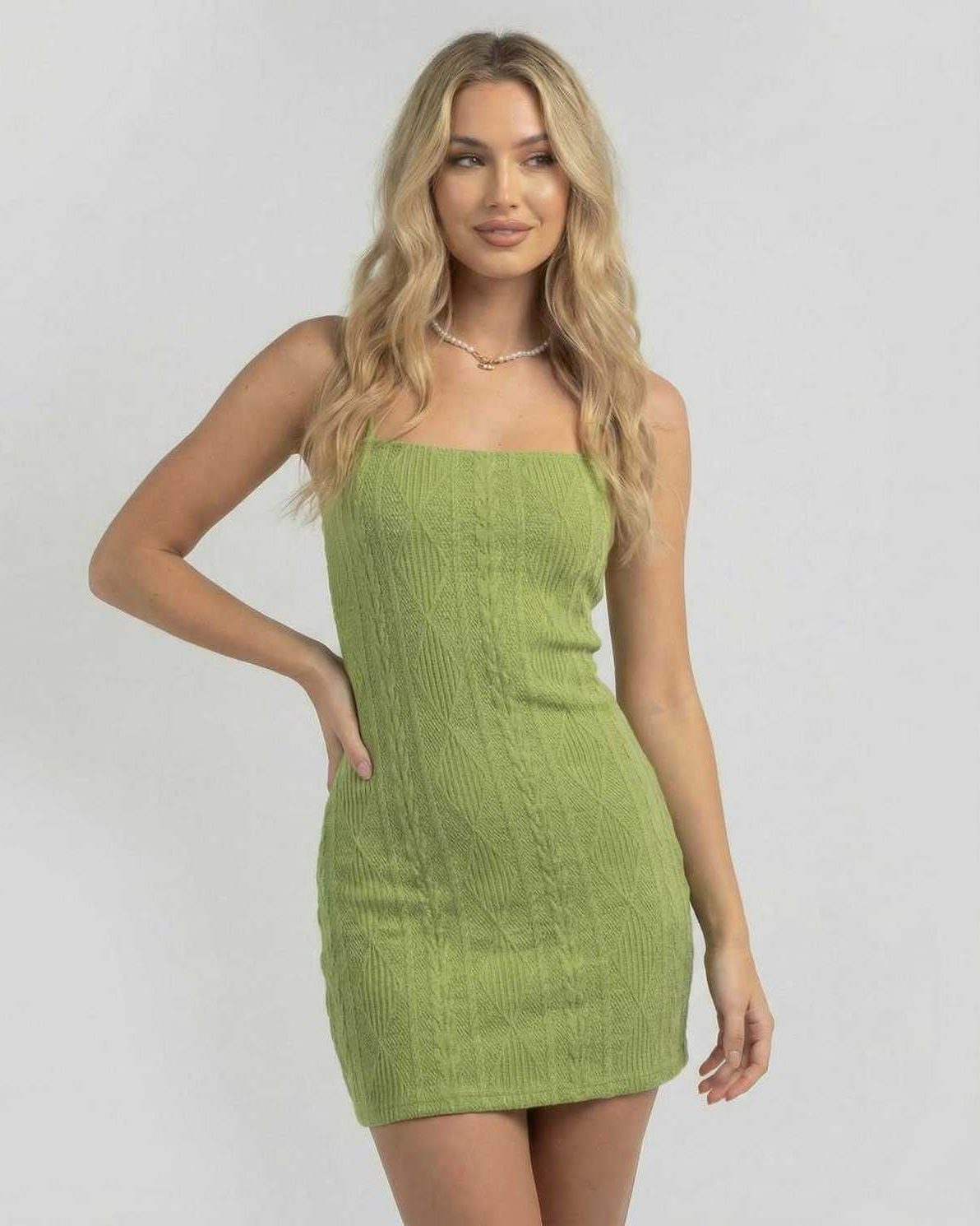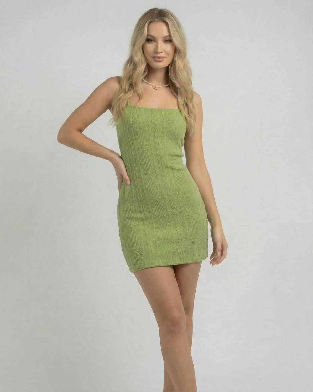 Tieto priliehavé mini šaty majú vysoký pás a úzky strih, ktorý vytvára uhladený tvar. Detail otvoreného chrbta prináša zvýraznený kontrast, vyvažujúc dĺžku nad kolená výrazným zakončením. Textúrovaná látka dodáva jemný rozmer, vďaka čomu sú tieto zelené mini šaty vhodné na mestský štýl aj večerné príležitosti.