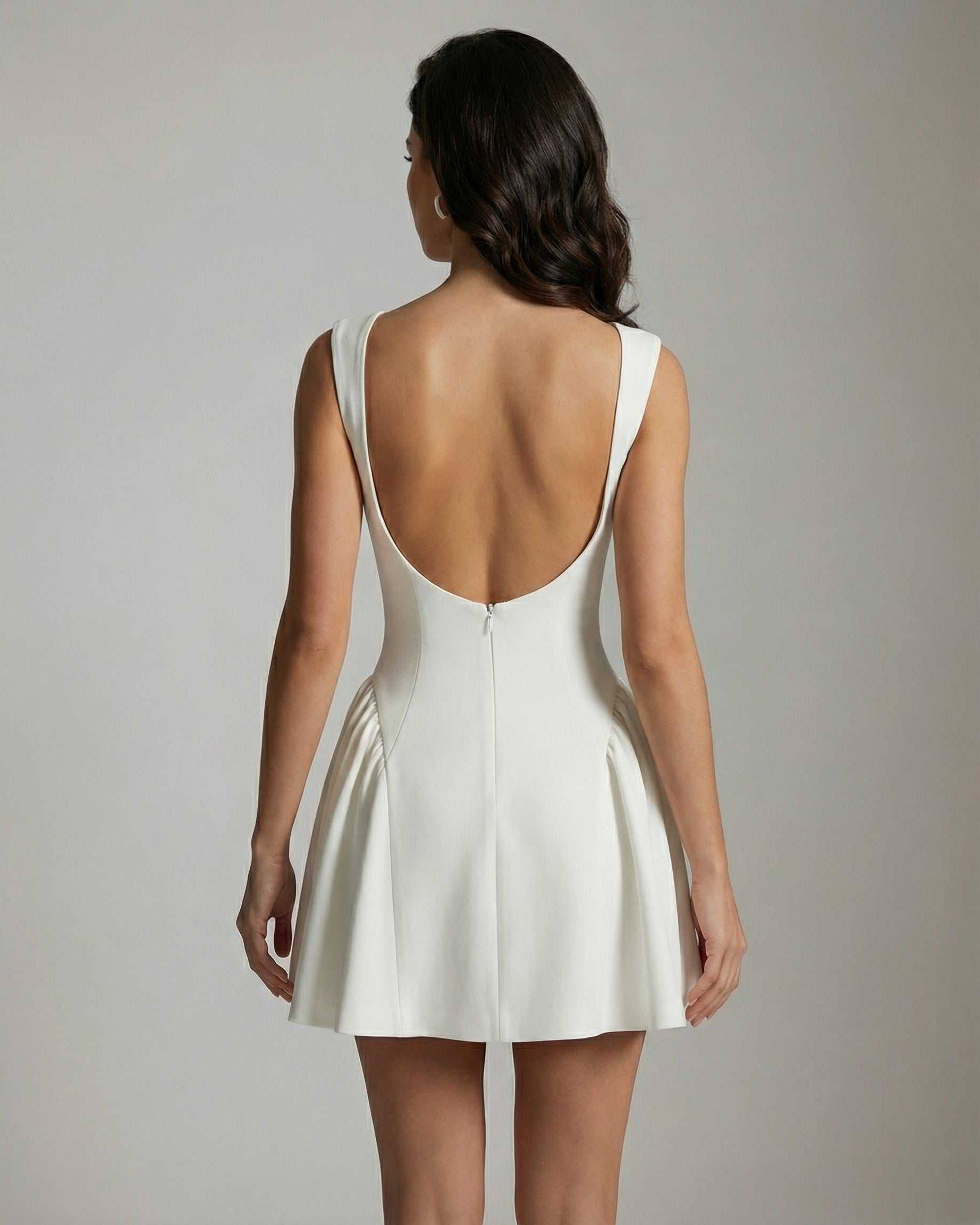 Urejena bela mini obleka, zasnovana za posebne priložnosti in prefinjeno dnevno-večerno stiliranje.